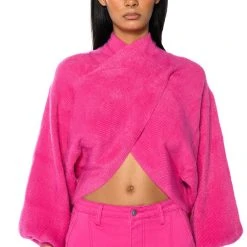 The perfect seasonal sweater is here, The AKIRA Label Honey Cross Front Fuzzy Sweater! This cozy piece is made with a stretch knit base fabrication, and features an all over soft and fuzzy design. Complete with a cross front detail, mock neck, long sleeves with ribbed knit hems, and a tulip bottom hemline. Pair with pleather pants and pumps for a weekday night out!
