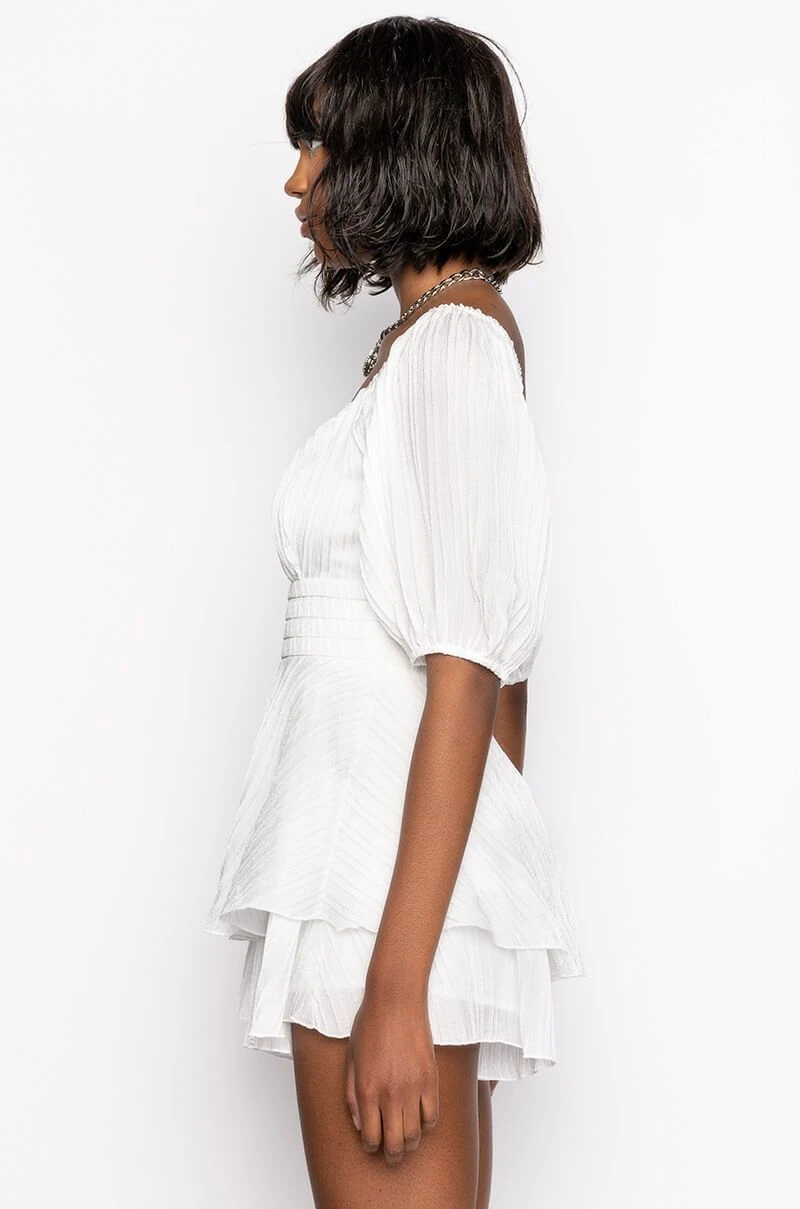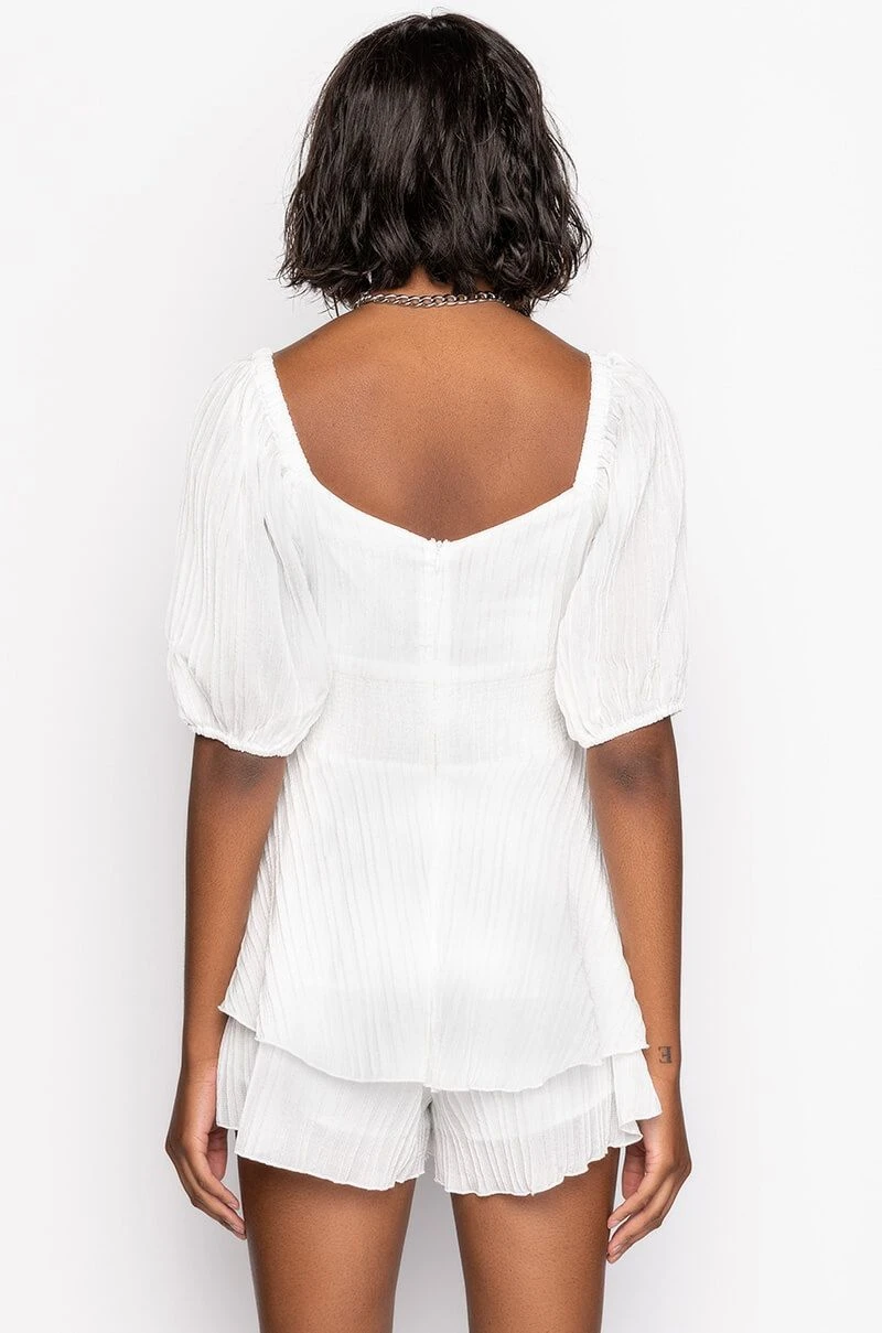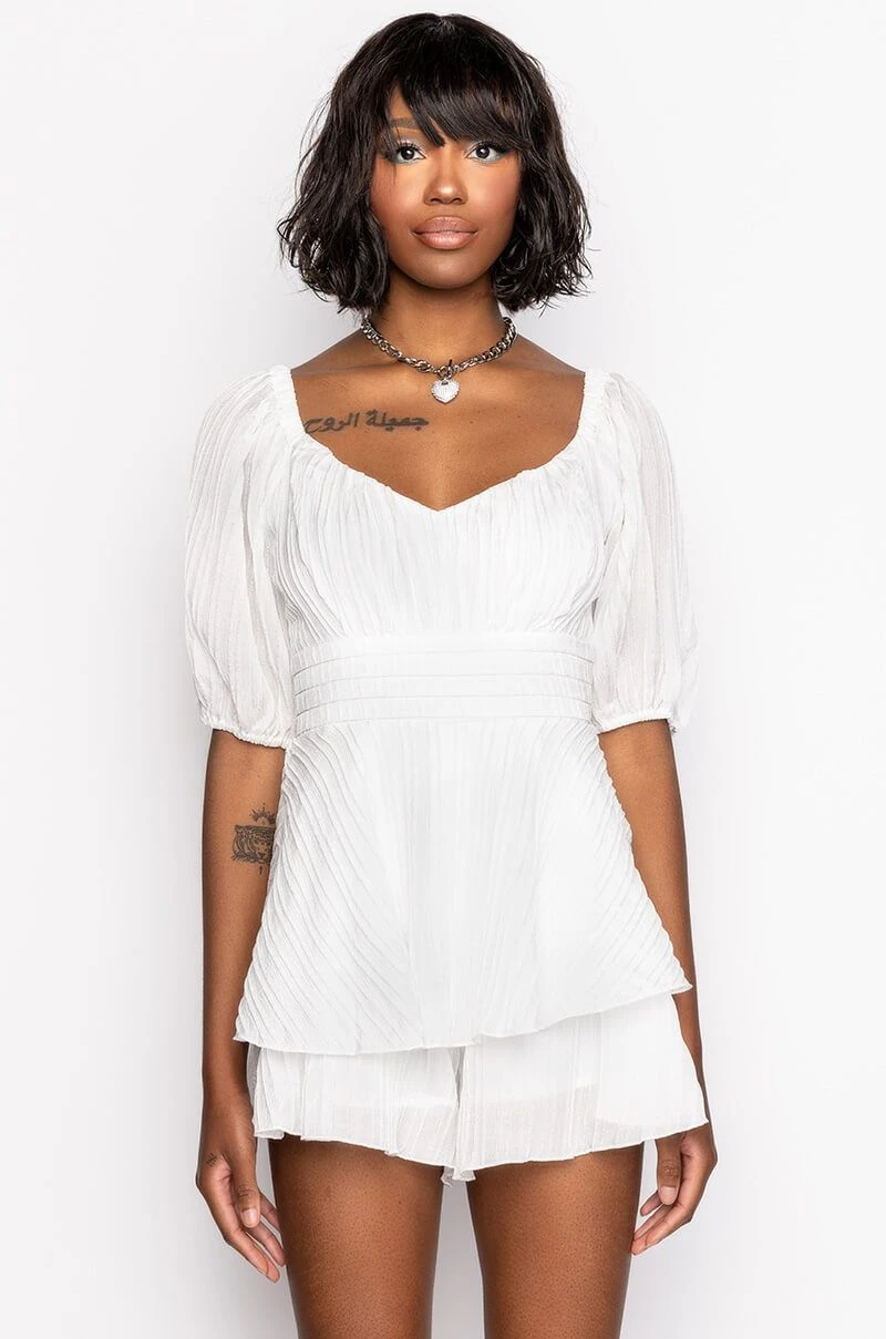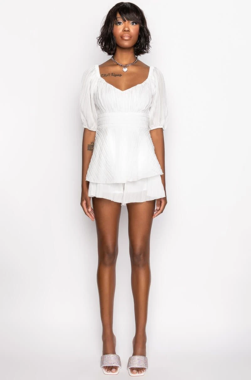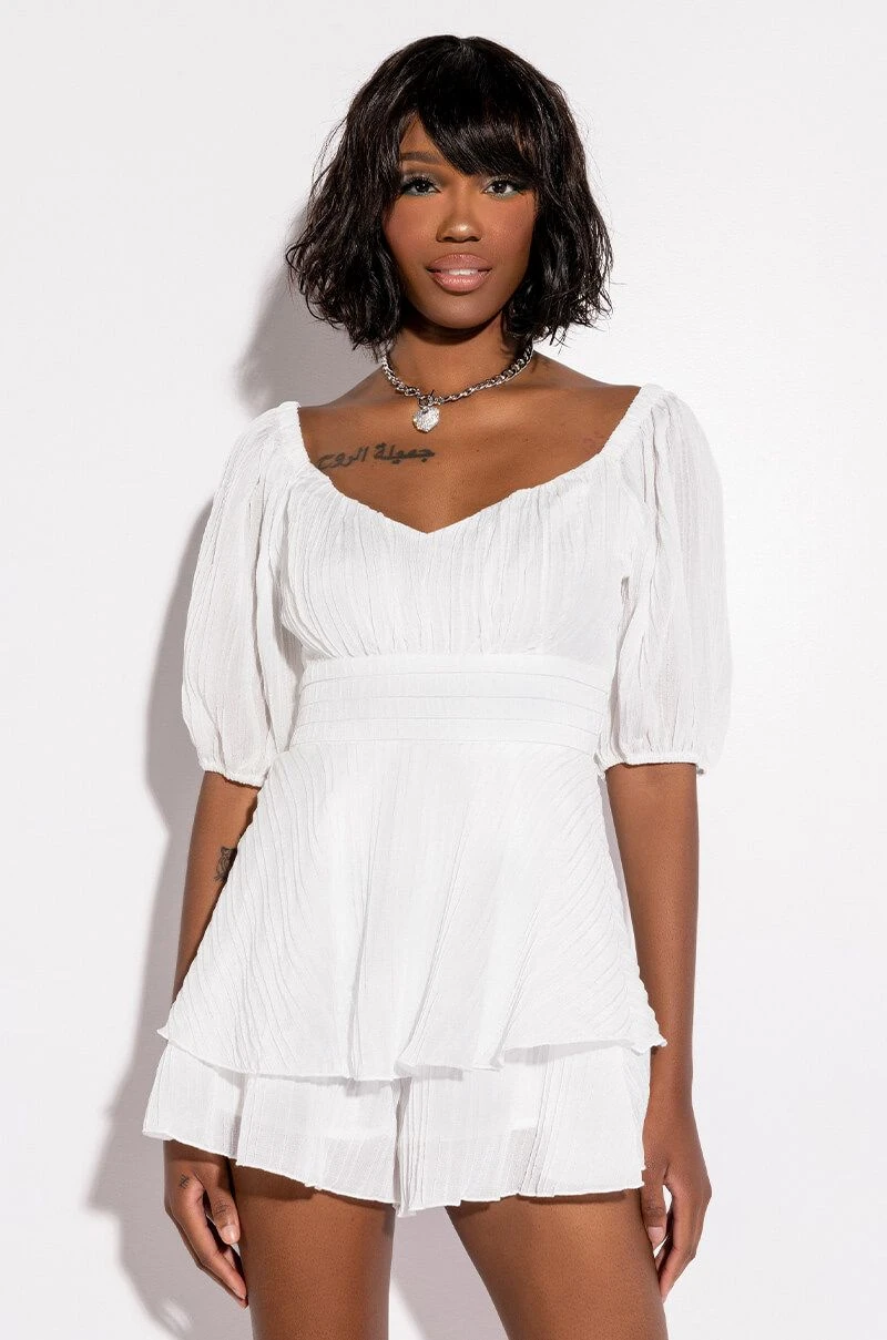The AKIRA Label Honey Quarter Sleeves Romper is made from a pleated chiffon fabrication and features a V neckline, puffed elbow-length sleeves with elastic detailing, a thick waistband, a layered ruffle hem, attached polyester inner shorts, and a tonal back zipper closure. Style this romper with a pair of strappy sandals for a sweet, summery look.