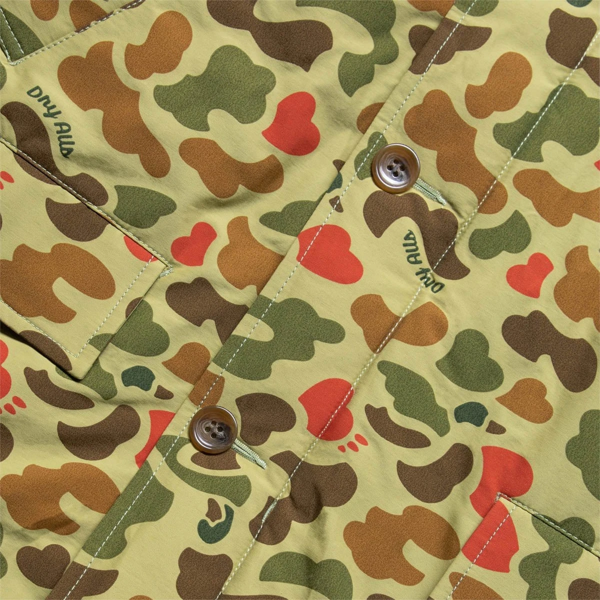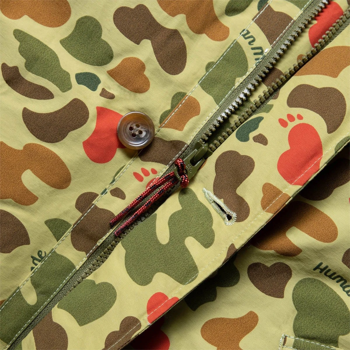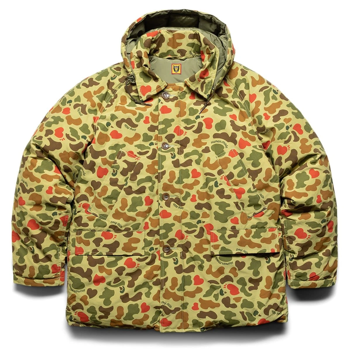 Down jacket with original camouflage pattern. It features a removable hood, hand warmers, and rib knit cuffs.