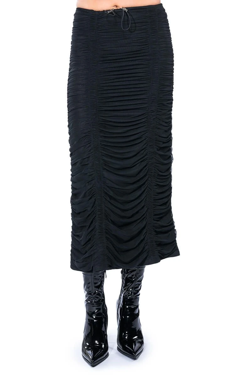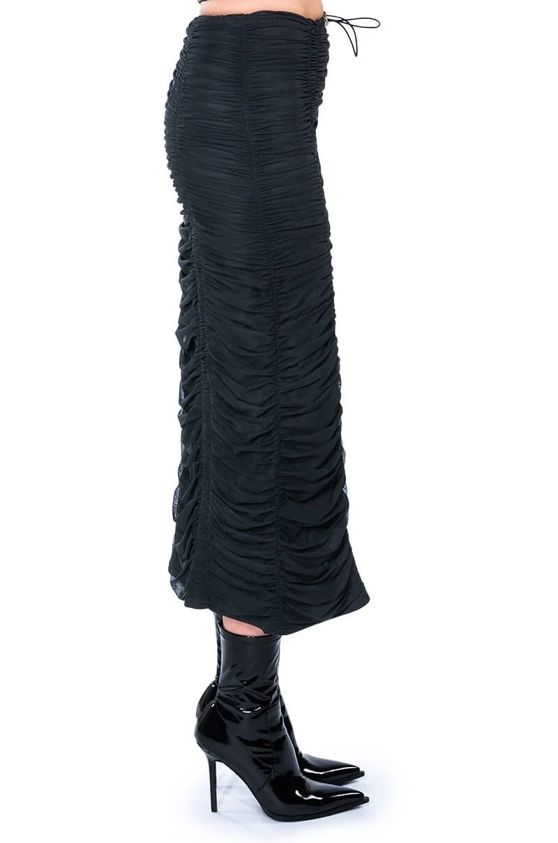 The AKIRA Label I Only Getter Better Ruched Maxi Skirt is made from a stretchy fabrication base and features a high rise waist, a toggle drawstring waistband, a ruched mesh outer layer, and a maxi length silhouette. Pair this piece with a crop tee and chunky combat boots to complete your trendy streetwear look.