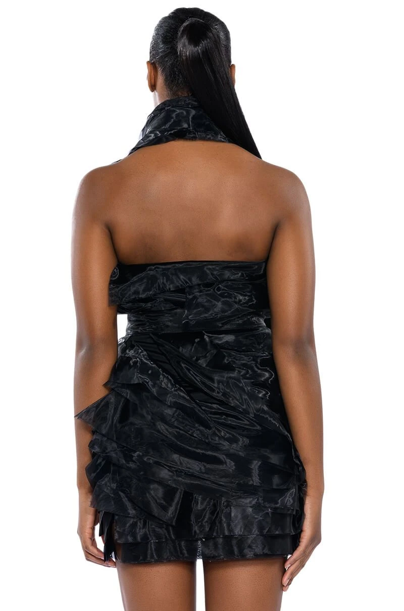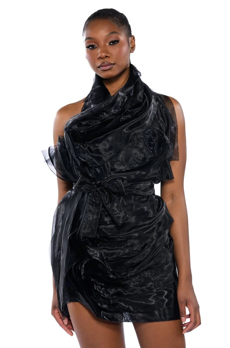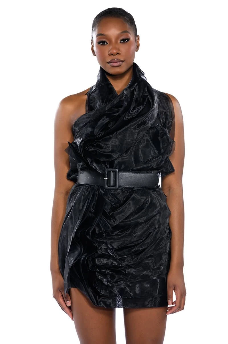 The AKIRA Label Isadora Belted Halter Neck Mini Dress is made from a slick fabrication base and features a wrapped snap button halter neckline, layered tulle detailing, a bodycon fit, a mini length silhouette, and a tonal side zipper closure. Complete with an included, adjustable vegan leather belt and a coordinating tulle sash to switch between while always staying cinched.