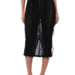 The AKIRA Label Its A Wrap Macrame Mesh Midi Skirt features a sheer, textured macrame mesh fabrication, a pull-on fit, vertical fringe stripe detailing, a bodycon midi silhouette, and a subtle back slit. Complete your set with the matching AKIRA Label Its A Wrap Macrame Mesh Sleeveless Mock Neck Top.