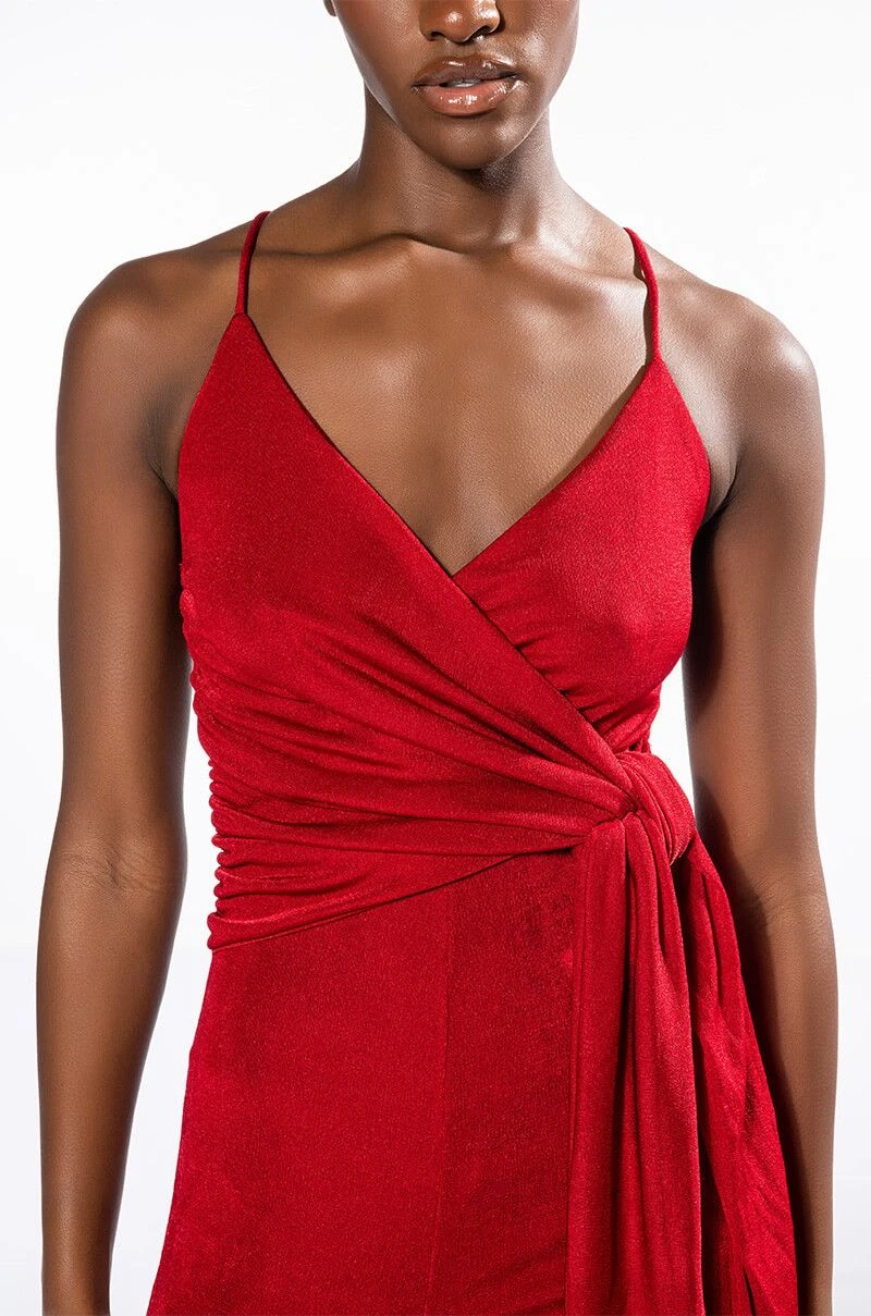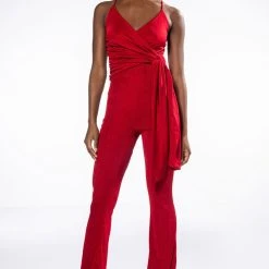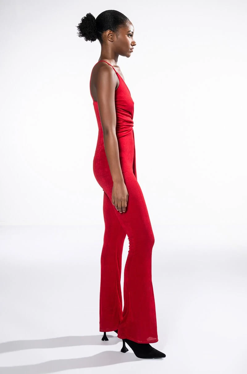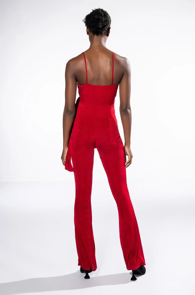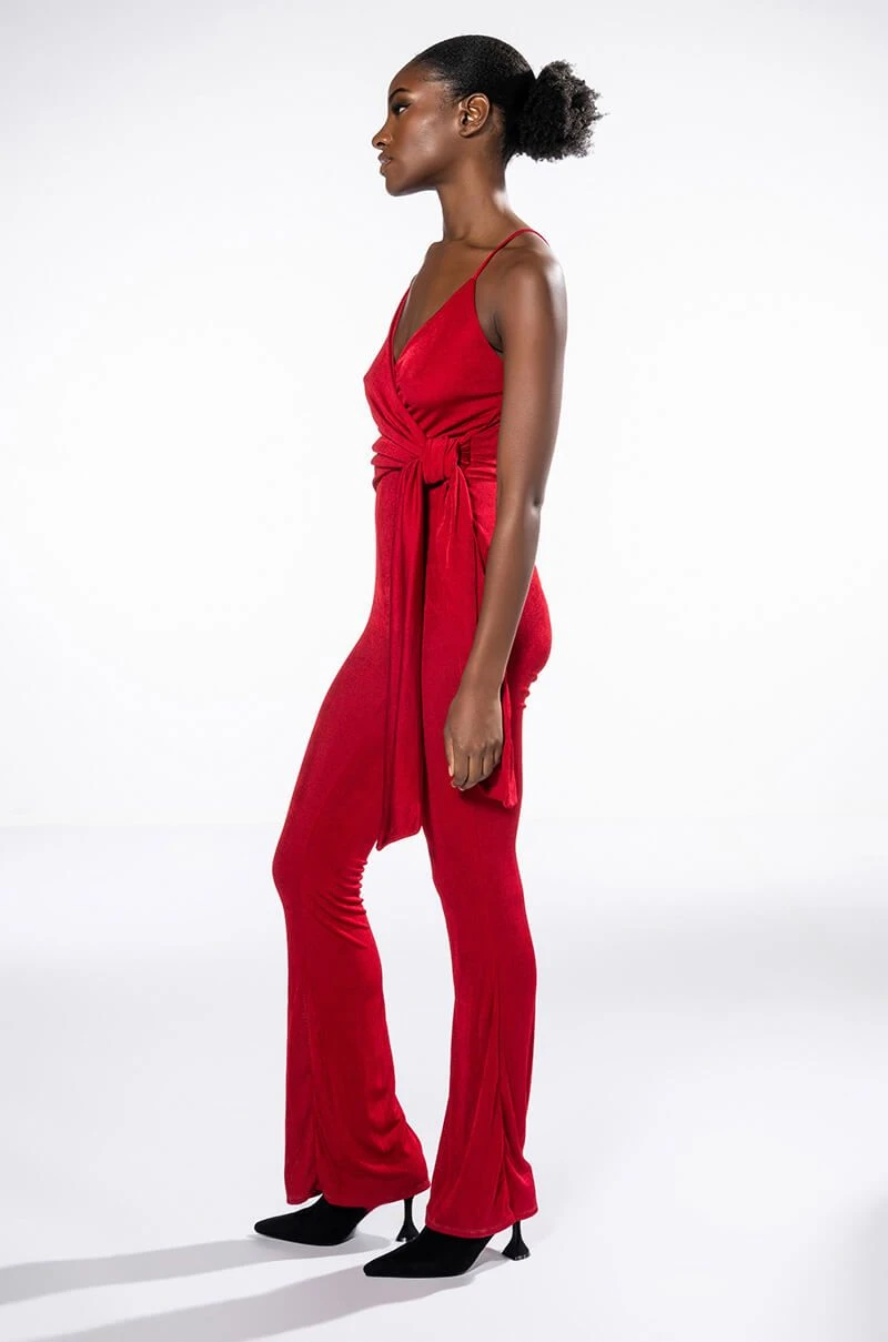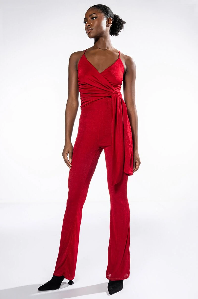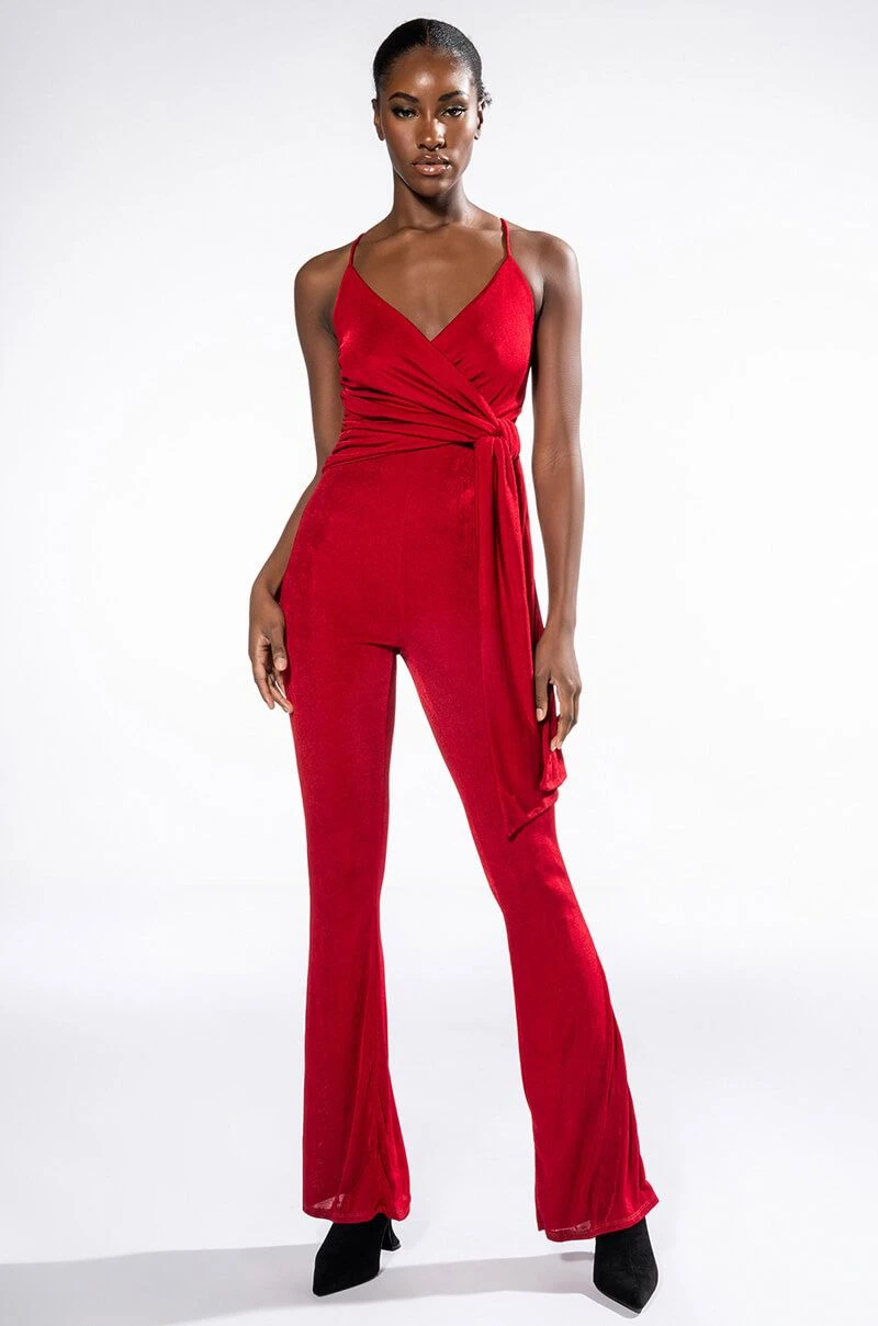 Your presence is a present. The AKIRA Label Its All For You Tie Front Sleeveless Jumpsuit features a luxurious jersey knit fabrication, a plunging neckline, a drape-y tie front bodice, slim adjustable tank straps, straight pant legs, and a pull-on silhouette. Pair this chic piece with stiletto pumps and a clutch.