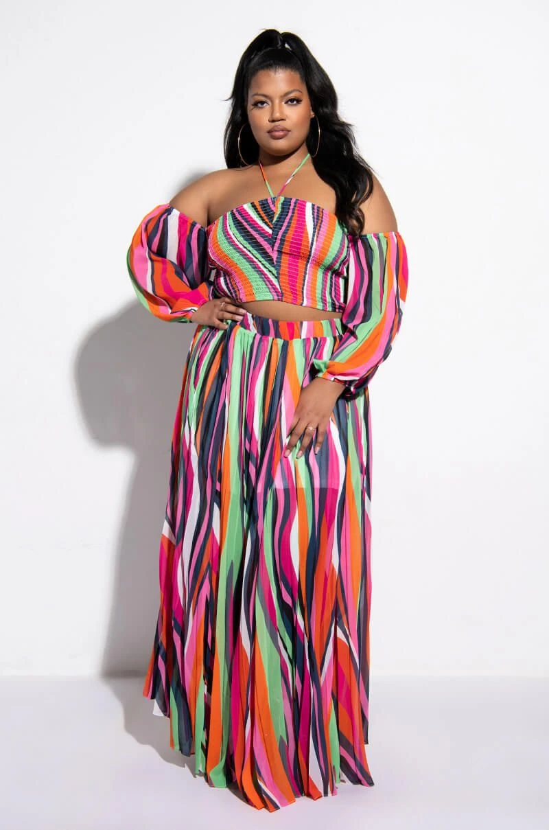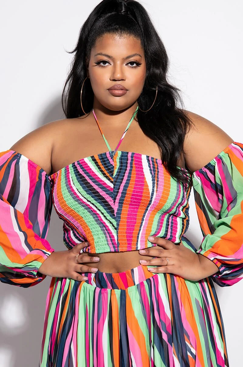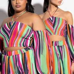 The AKIRA Label Ivy Smocked Halterneck Blouse is made from a smocked elastic base and features an off-the-shoulder fit, a pointed halter neckline with thin straps, long blouson sleeves with elastic detailing, multicolor striped patterning, and a cropped silhouette. Pair this piece with the matching AKIRA Label Ivy Flowy Maxi Skirt and some mules for a colorful vacay look!