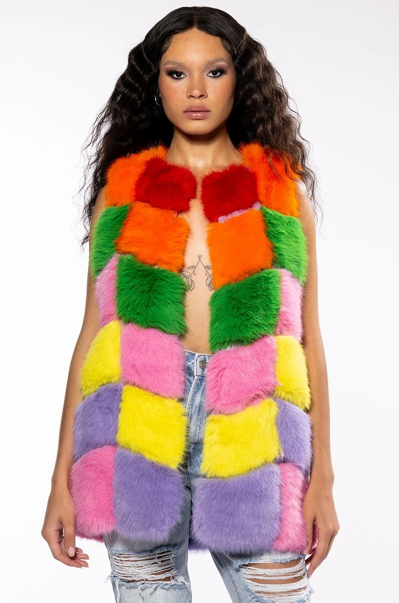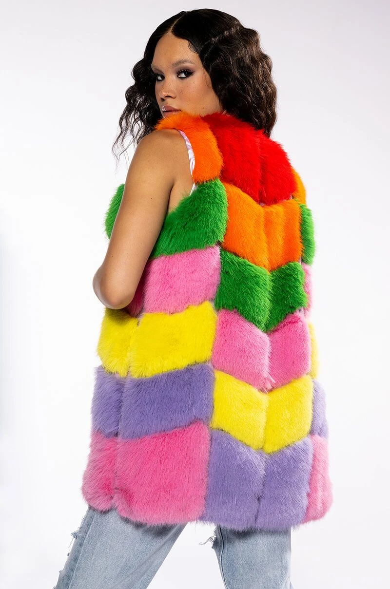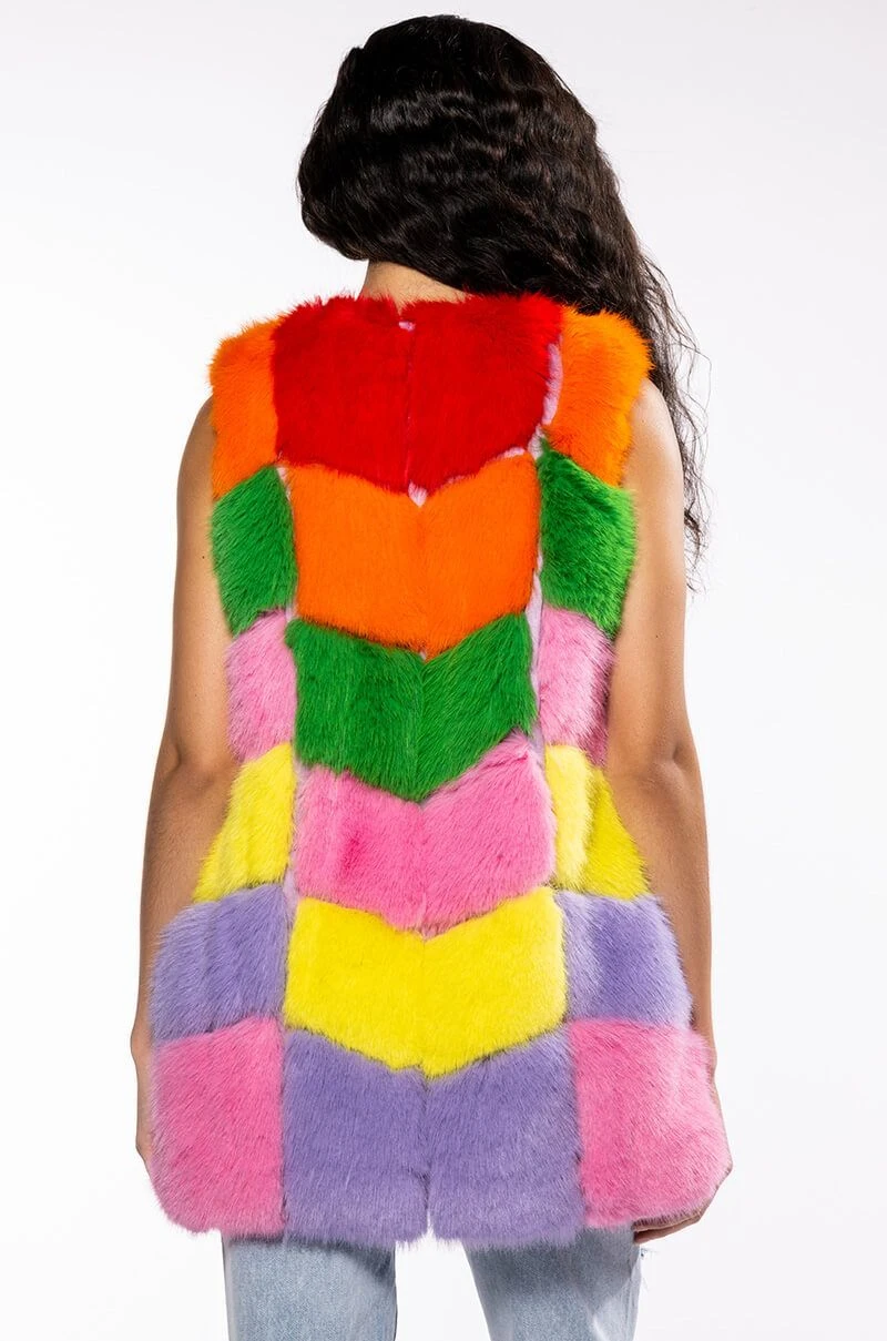 The Jayley Brand Faux Fur Rainbow Vest features is made from a suede-like fabrication base and features soft faux fur paneling in a checkered rainbow pattern, a high, rounded neckline, a sleeveless design, a longline silhouette, slick lining, and tonal hook and eye front closures.