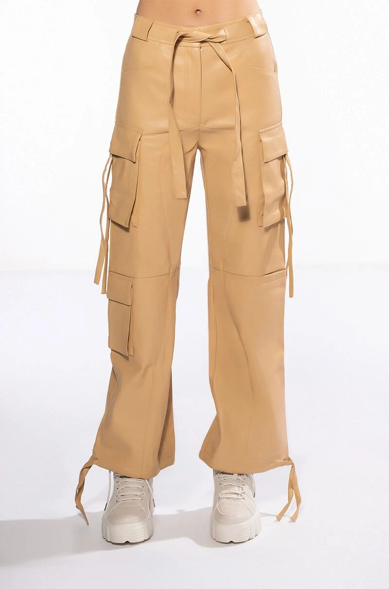 The AKIRA Label Jazz Faux Leather Jogger is made from a pebbled vegan leather fabrication and features a high rise waist, working belt loops, patch pockets, cargo flap side pockets with faux leather straps, mock flap back pockets, a relaxed fit, and cinched ankles with faux leather tie detailing. Complete with a zippered hook and bar front closure with faux leather ties.
