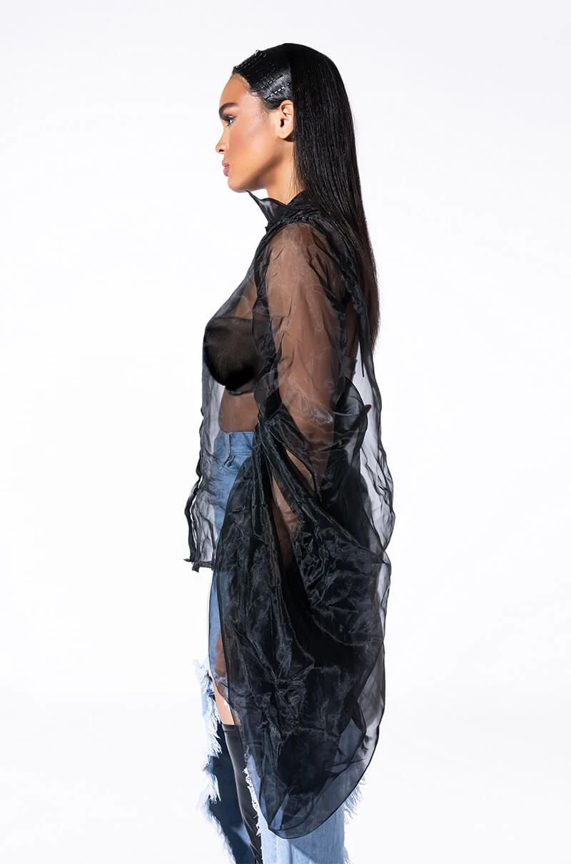 Celebrate in style with the AKIRA Label Joyeux Anniversaire Super Voluminous Sleeve Blouse! This lightweight top is made from a sheer chiffon fabrication and features a collared neckline, billowing, dramatic sleeves with ruched detailing, and a button down front closure. Style this voluminous piece over bralettes and trousers to complete your chic look.