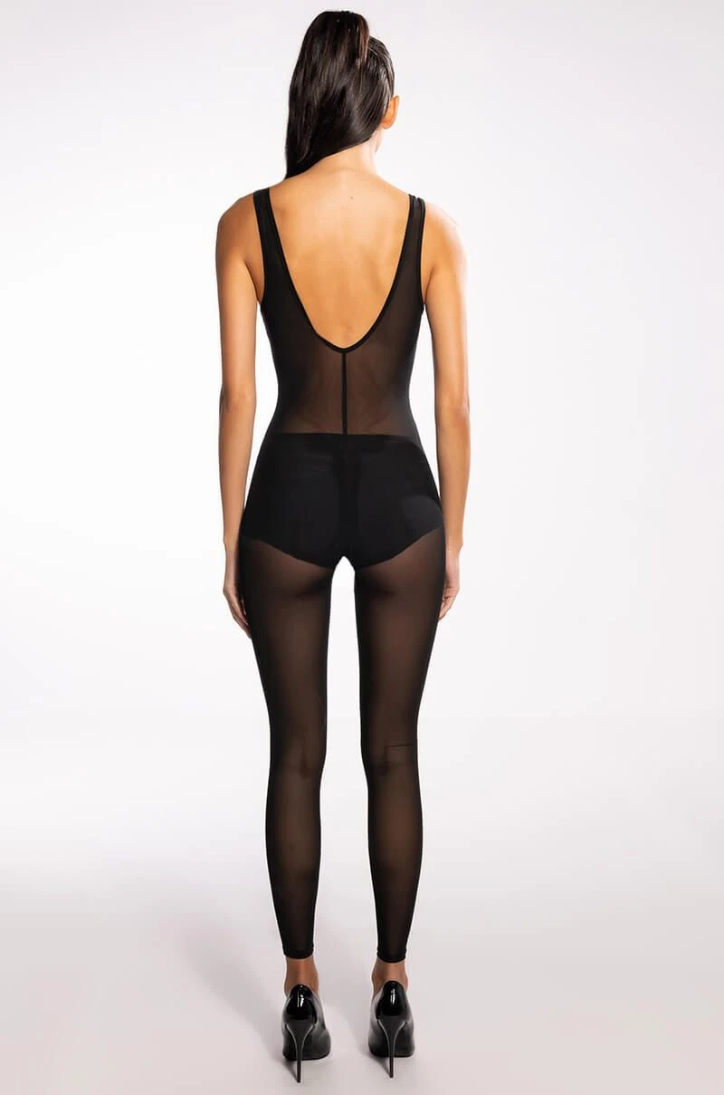 Take care of business in The AKIRA Label Jump On It Sleeveless Mesh Jumpsuit. This sheer mesh one piece features wide tank straps, a scoop neckline, attached skinny leg pants, a sexy bodycon fit, and a slip-on silhouette. Pair this piece under a jean jacket, crop top, and denim shorts for a sexy layered look.
