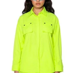 The AKIRA Label Kai Button Down Shirt is part of a flowy chic two-piece set, made from a lightweight, neon base fabrication. It features a pointed foldover collar, long sleeves with buttoned cuffs, snap buttoned flap front pockets with silver metallic detail, and a button down front closure. Complete with an oversized, long line silhouette. Style with the coordinating bottoms, The AKIRA Label Kai Pull On Shorts, and chunky boots for a bold, everyday look.