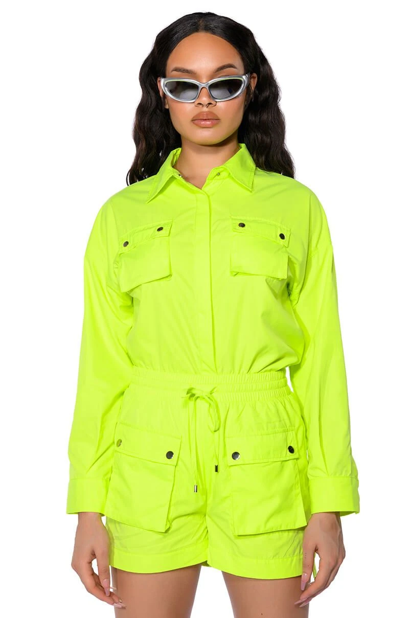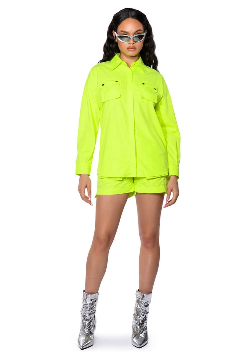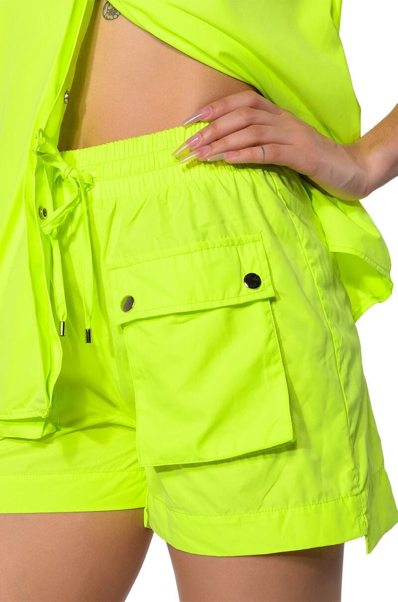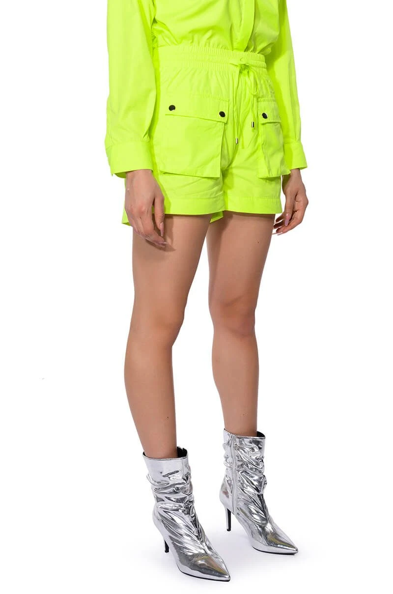 The AKIRA Label Kai Pull On Shorts are part of a flowy chic two-piece set, made from a lightweight, neon base fabrication. It features a wide, shirred elastic drawstring waistband, buttoned flap front pockets with silver metallic detail, and a mini length silhouette. Complete with working back pockets and a pull-on fit. Style with the coordinating top, The AKIRA Label Kai Button Down Shirt, and chunky boots for a bold, everyday look.
