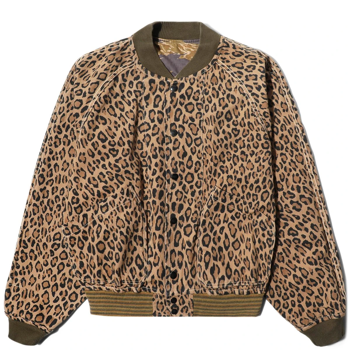 This vintage-inspired, fully reversible Blouson is woven from rugged herringbone cotton featuring Tiger Camo on one side and leopard print on the other. Produced with two utilitarian patch pockets at the waist on each side and flexible ribbed collar, cuff, and hem for added comfort. Finished with a relaxed, roomy fit hitting at the waist.