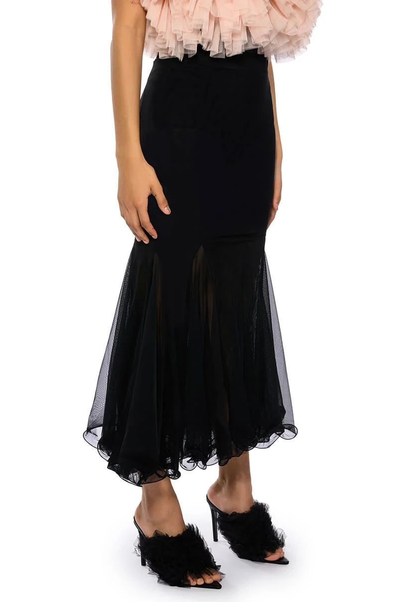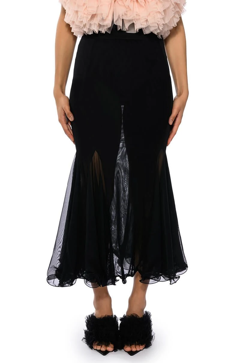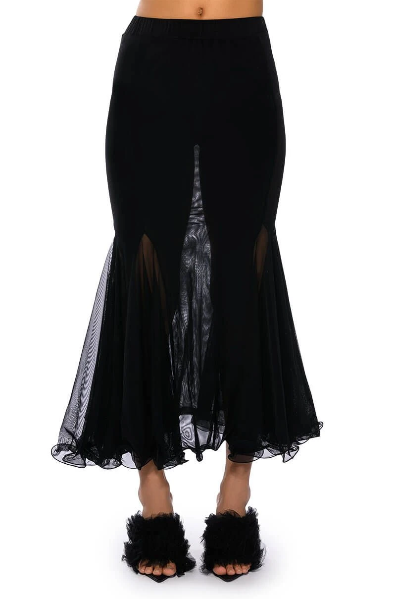 Set trends in The AKIRA Label Keep Up Mermaid Flare Mesh Midi Skirt. This sheer mesh piece features a wide elastic waistband, a midi length silhouette, a flattering flared mermaid hem, and a pull on fit.