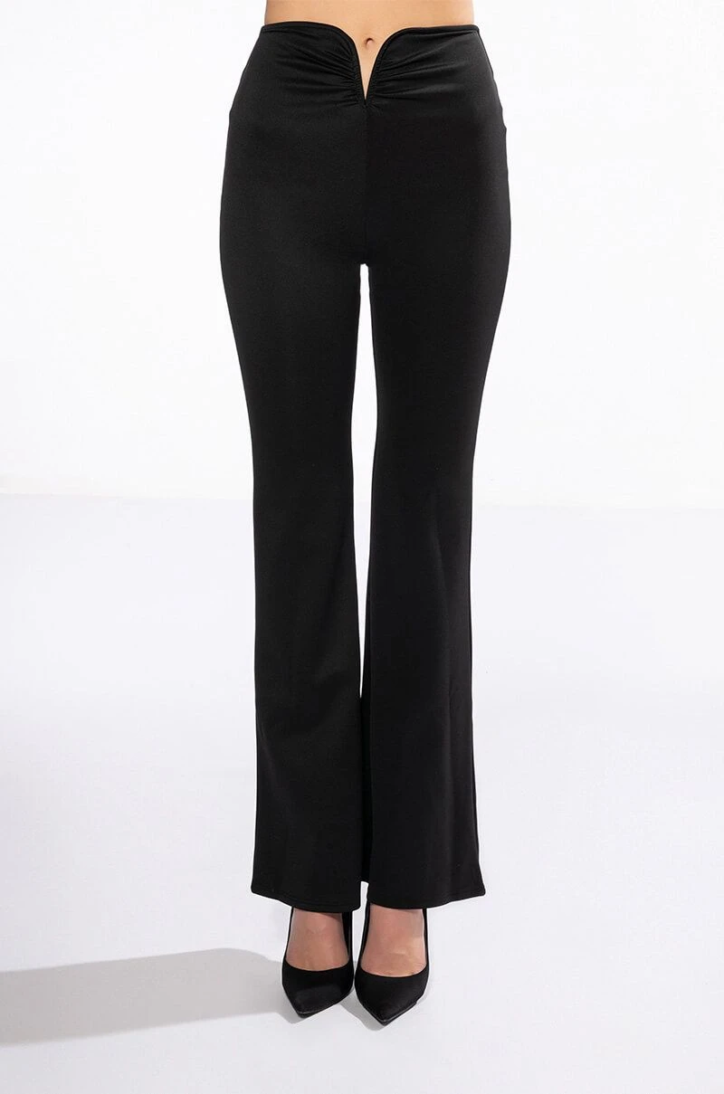 The AKIRA Label Know It All Curved Waist Flare Pants are made from a slick, stretchy fabrication and feature a high rise waist, a curved arch waistband with boning for structure, flared pant legs, and a tonal back zipper closure.