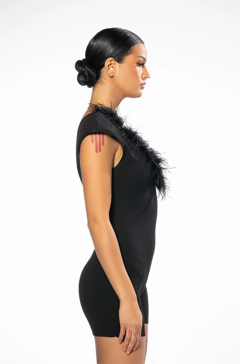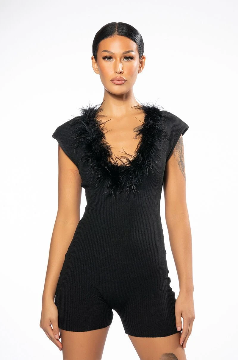 The AKIRA Label Kyanite Feathered Romper is made from a stretchy ribbed knit fabrication and features a plunging neckline with opulent feather trim, short cap sleeves, a plunging back cutout, attached shorts, and a pull-on fit.