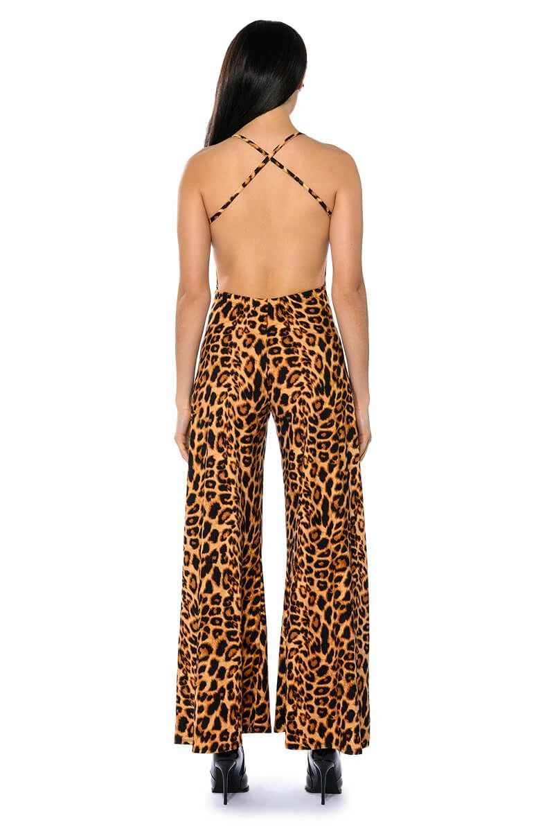 The AKIRA Label Leopard Makes Me Happy Jumpsuit is made from a soft, stretchy fabrication and features a bold, leopard print, cross back tank straps, a V-shaped neckline, and a wide leg silhouette. Complete with a sexy open back with an elastic band, a slip-on fit, and an included leopard print bandana. Style with platform pumps to finish your look.