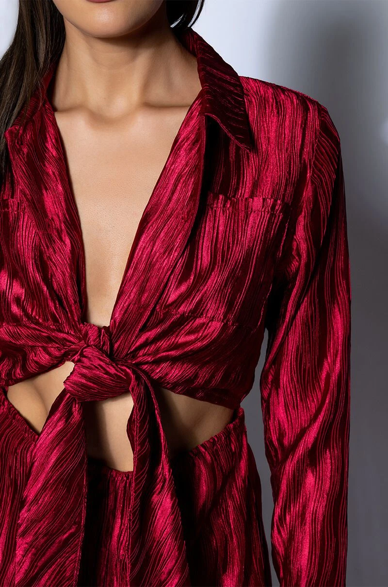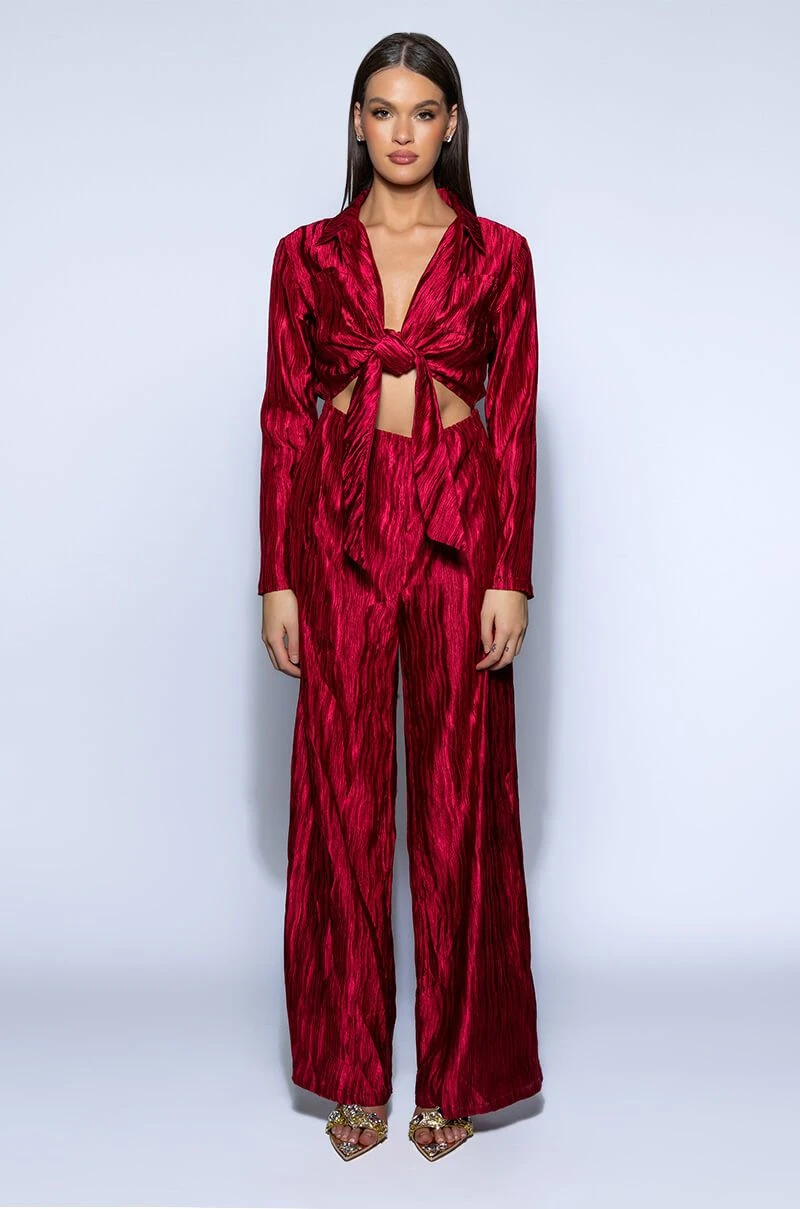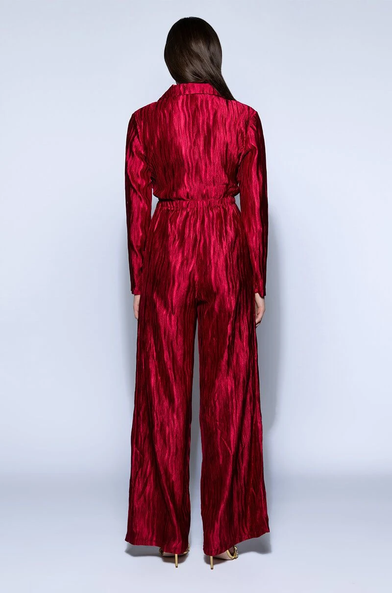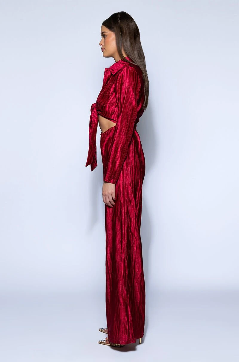 The possibilities are endless with The Akira Label Limitless Oversized Satin Jumpsuit! This piece is made from a lightweight satin fabrication and features a pleated design throughout, a point collar with a button-up and tie front closure, long sleeves, and princess seam detailing. Complete with two front pockets, a sexy waist cutout, a wide, elastic back waistband, and a flowy wide leg design. Pair this piece with black stiletto booties and a clutch for a classy going-out look!