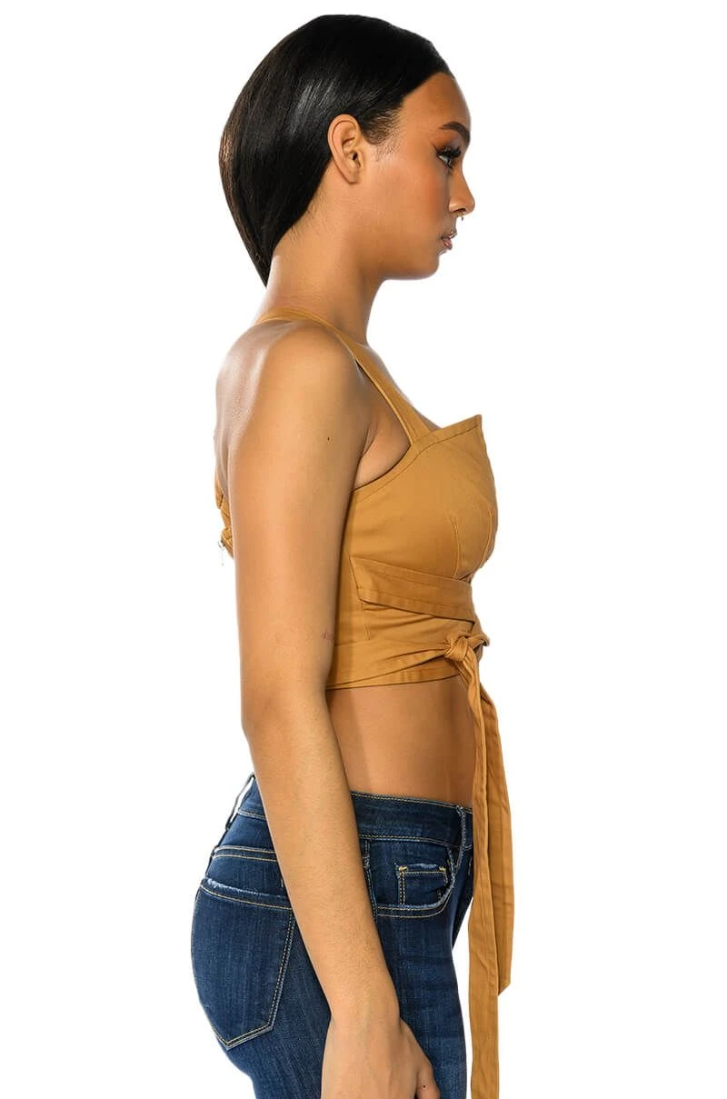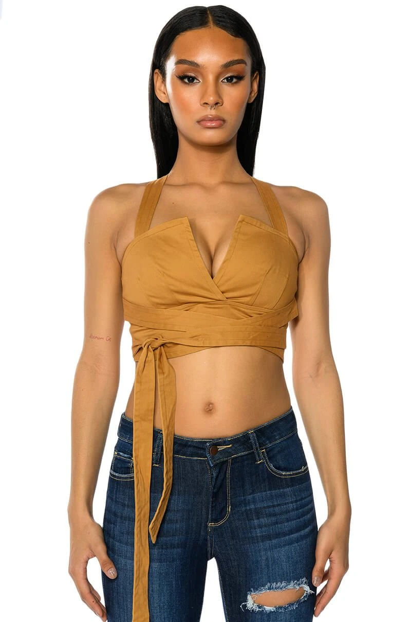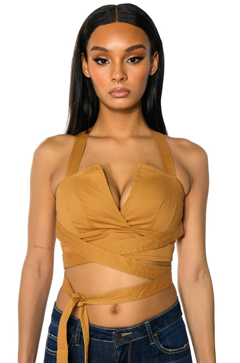 The AKIRA Label Londyn Cross Back Wrap Tank Top is made from a soft, structured base fabric and features a unique wrap front design, adjustable thick tank straps, and a V-cut neckline. Complete with wrap-around waist straps, cross back straps, scrunched elastic at the back for a comfortable fit, and an exposed back zipper closure. Pair this cropped top with the coordinating bottoms, The AKIRA Label Londyn Wide Leg Trouser, for an unbeatable London look!