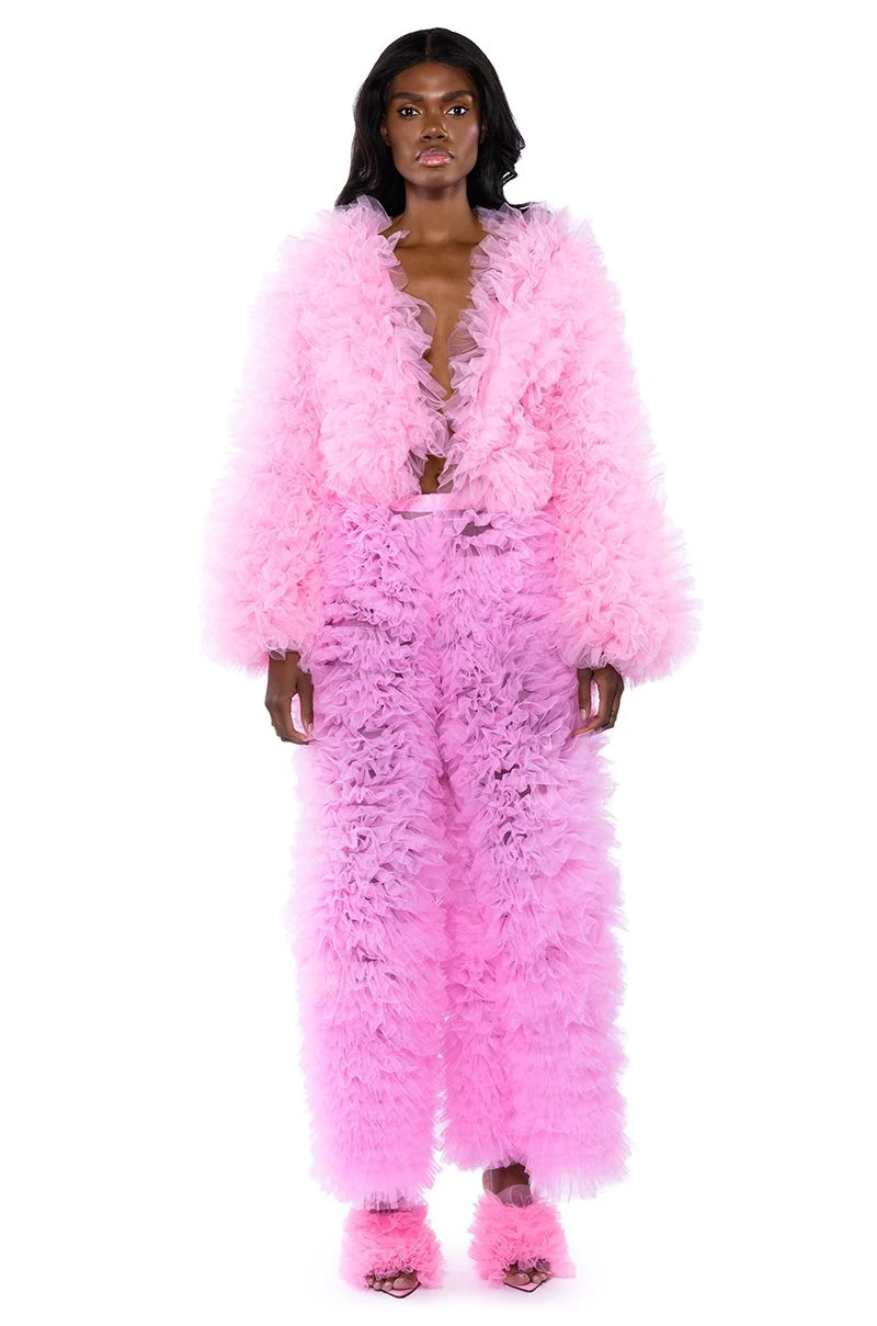 We’re falling for The AKIRA Label Love You Lou Lou Tulle Jacket In Pink! This ultra chic number is made from a mesh base fabrication, and features an all over luxe tulle design, long sleeves, an open front, cropped silhouette, and a smooth, satin inner lining. Pair with a baby tee, straight leg denim, and stiletto booties for an effortlessly glam look!