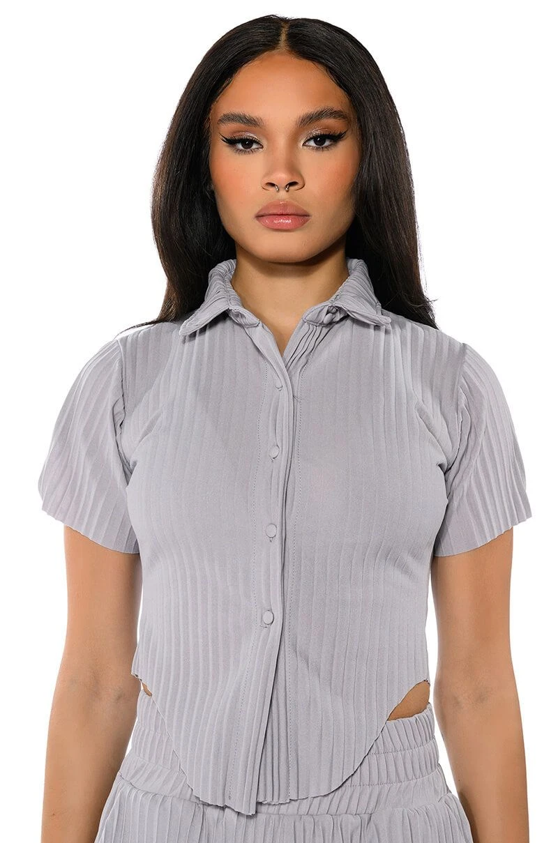 The AKIRA Label Lucy Short Sleeve Button Down is a part of an elegant 3-piece set, and is made from a pleated polyester fabrication. Complete with a foldover collar, short sleeve silhouette, cloth button down front closure, and rounded hems. Pair with the coordinating AKIRA Label Lucy High Rise Wide Leg Pant, Lucy Bralette, and booties for a chic, executive look.