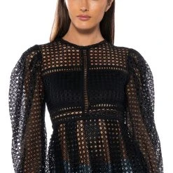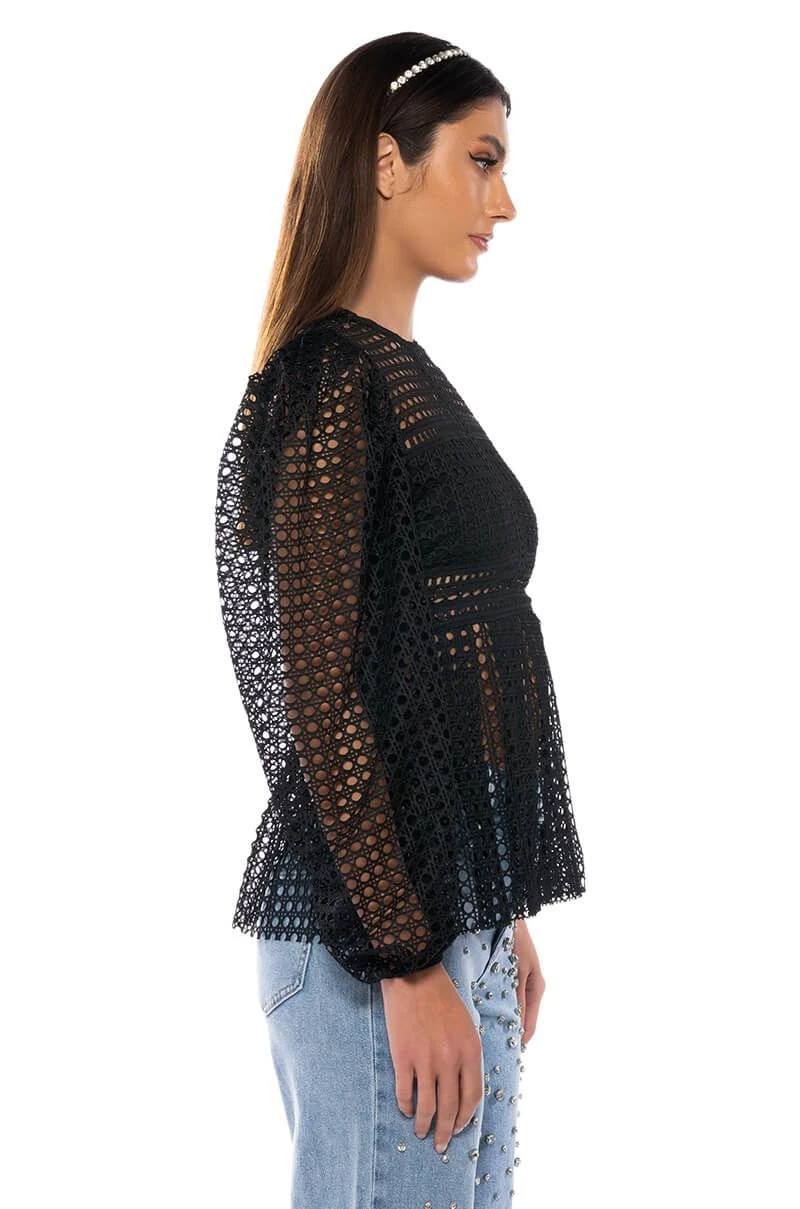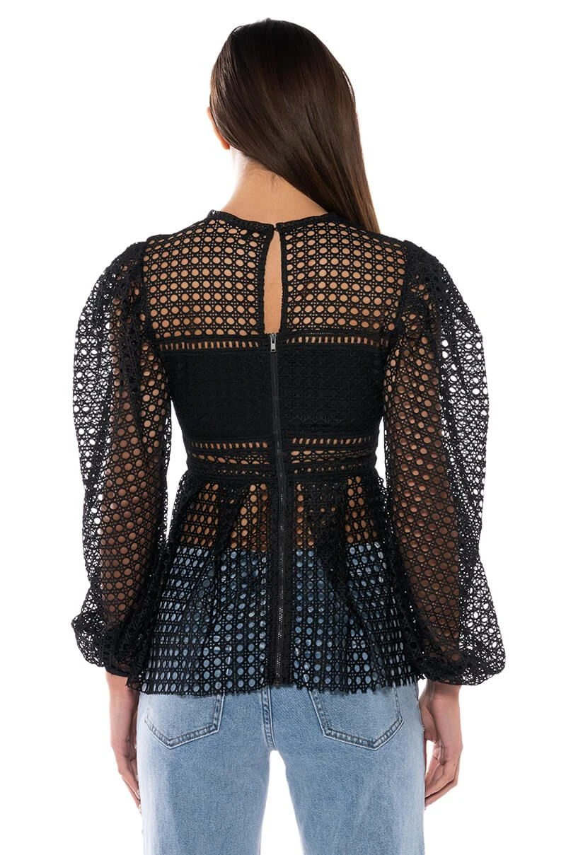 Conquer it all in The AKIRA Label Make The World Yours Peplum Fitted Long Sleeve Blouse! This ornate top is made from a sheer lattice lace fabrication and features a high, rounded neckline, a hooked keyhole back, long blouson sleeves, a fitted bodice, opaque chest paneling, a peplum hem, and an exposed back zipper closure.