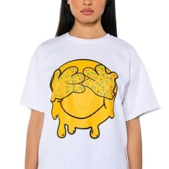 The Making Up For Lost Time Embellished Oversize Tshirt is made from a stretchy cotton fabrication and features a crew neckline, boxy short sleeves, and an oversized silhouette. Complete with an iridescent sequin and beading detailed melting smiley face emoji graphic.