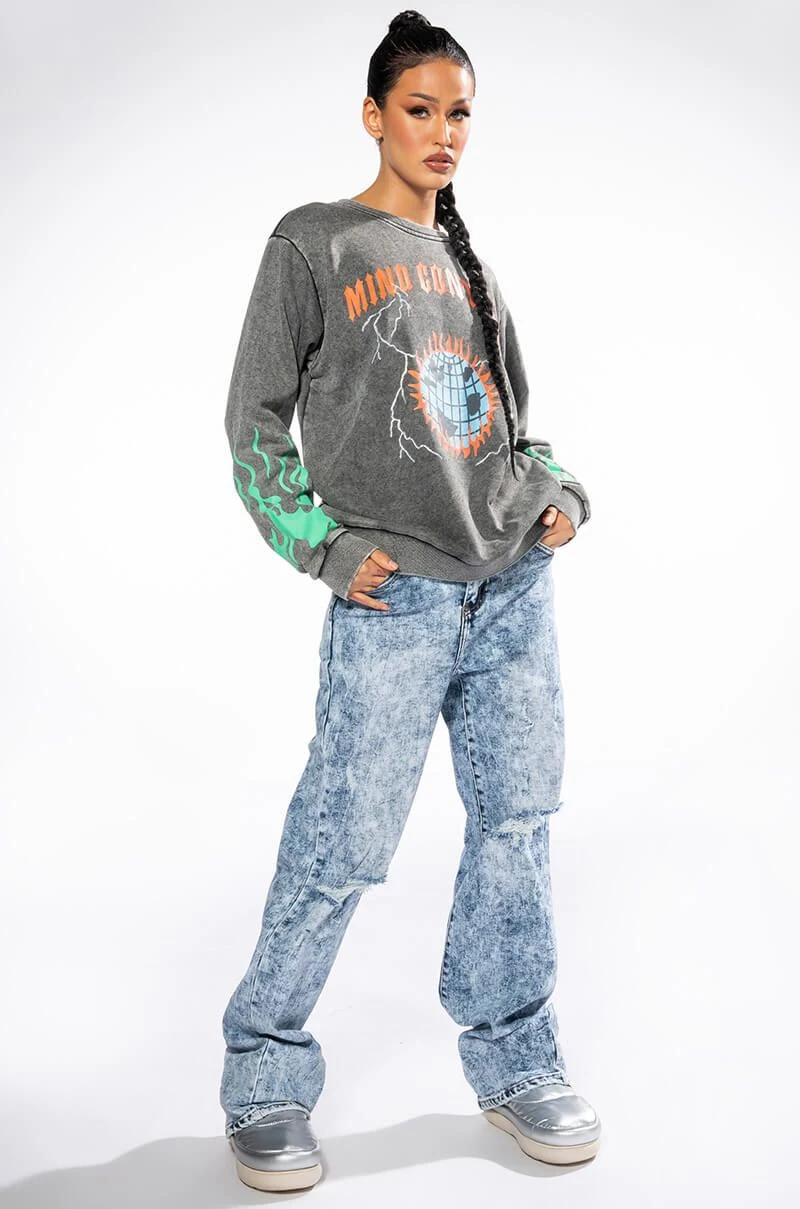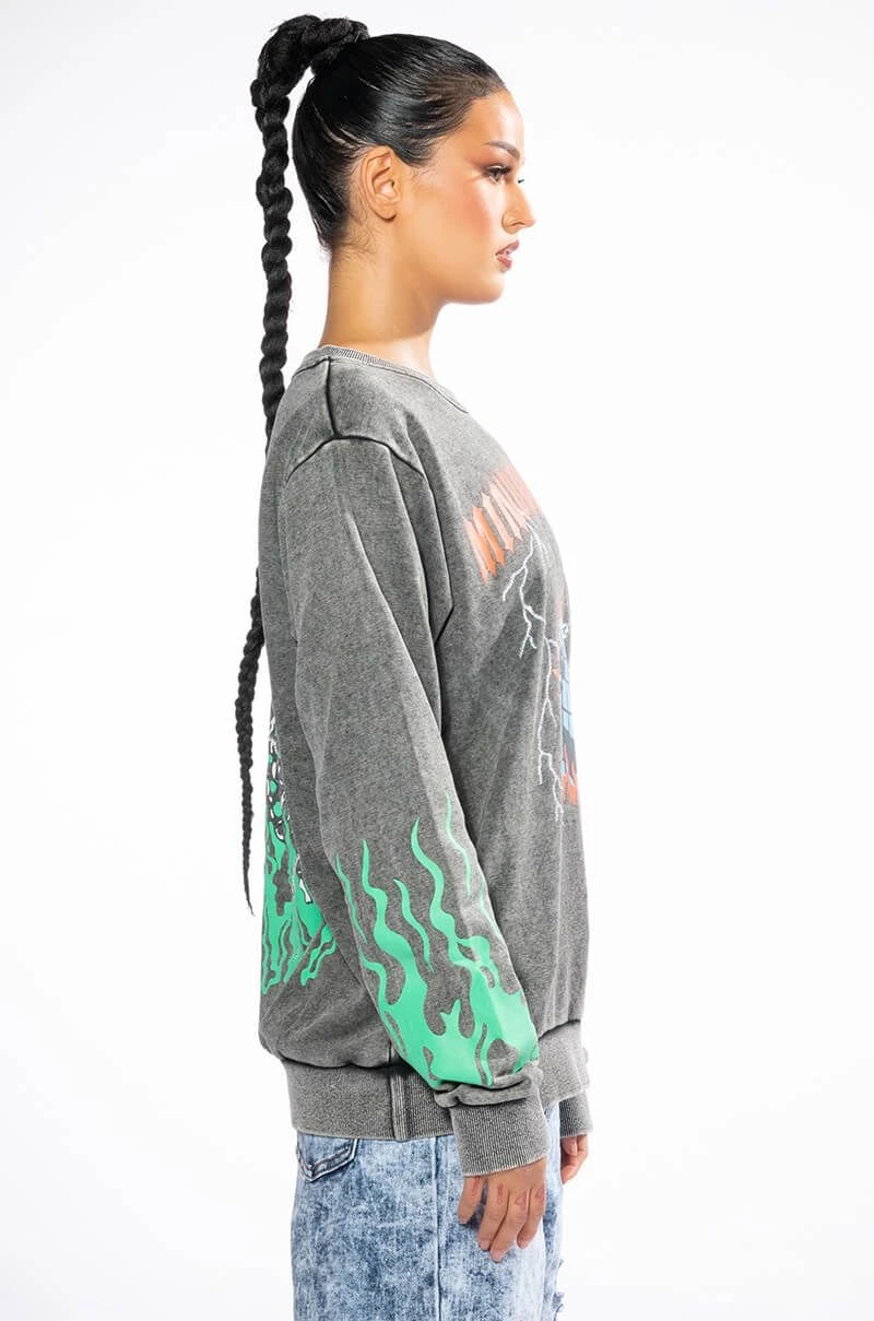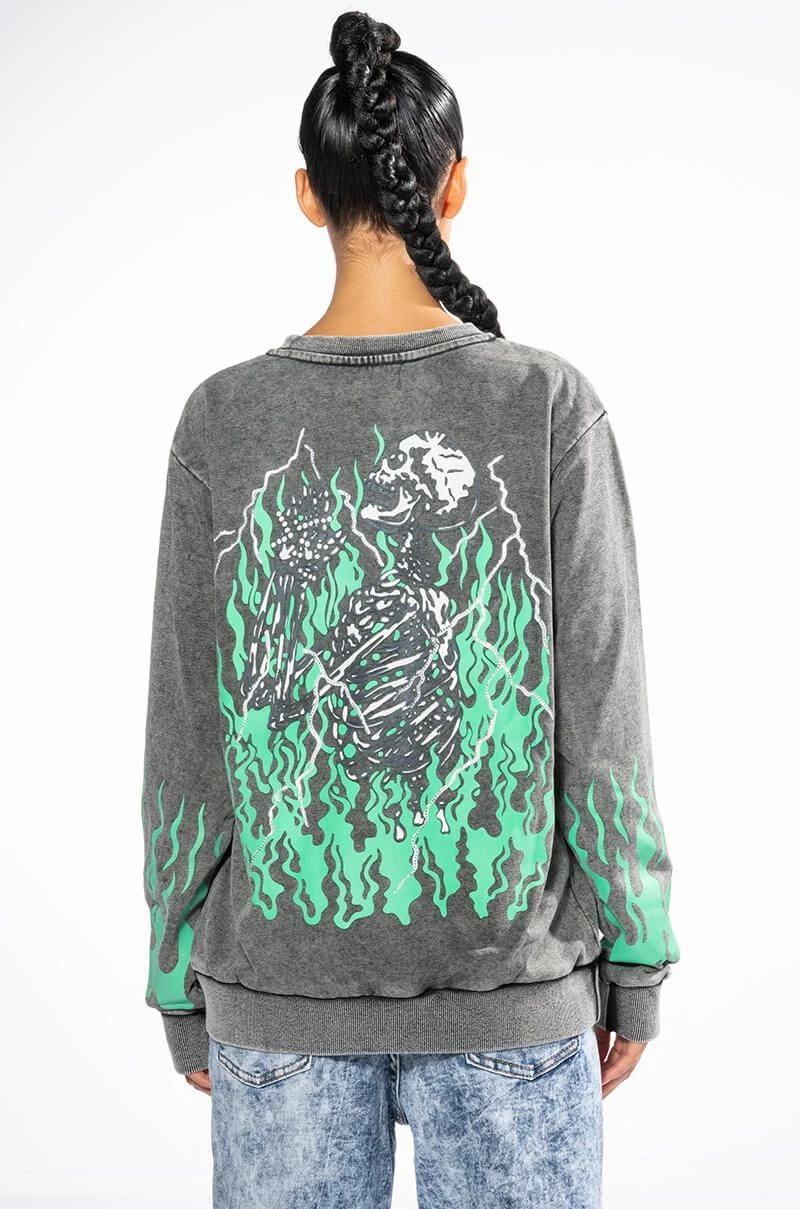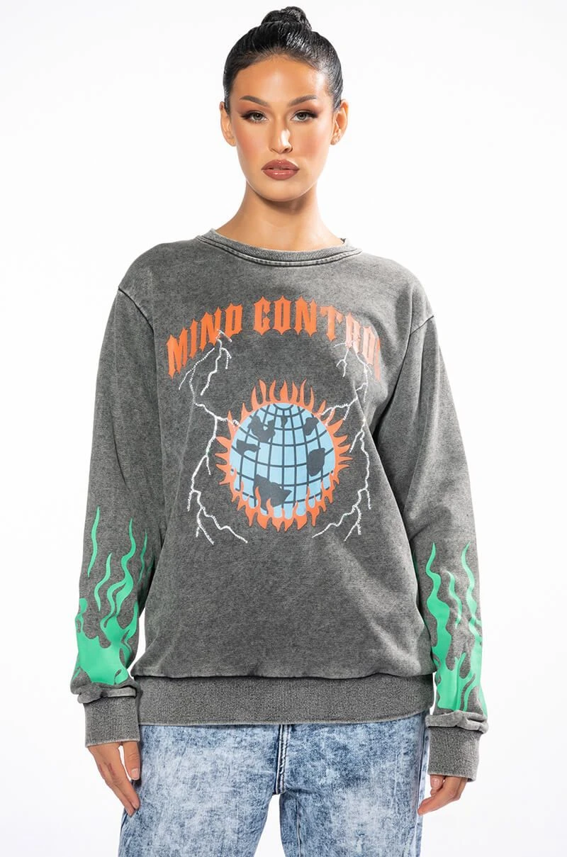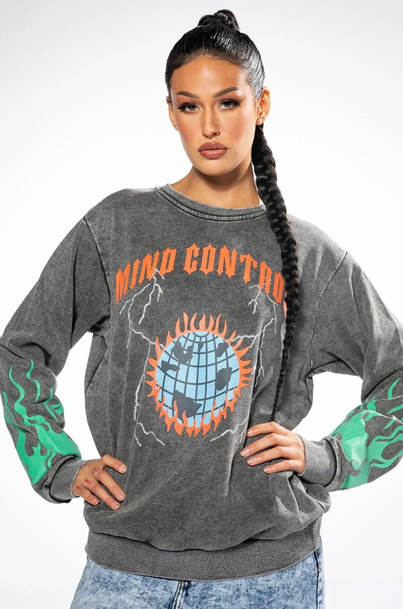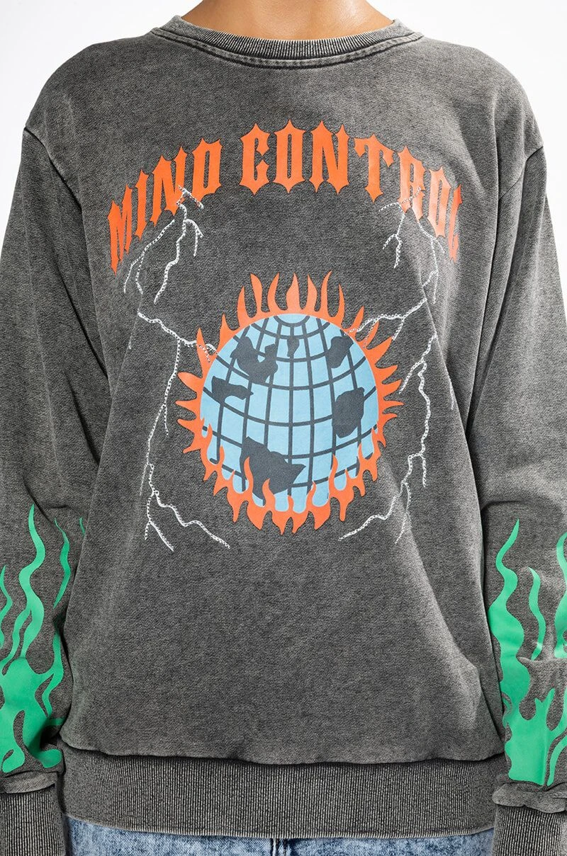 The AKIRA Label Mind Control Crewneck Sweatshirt is an oversized soft cotton poly blend top featuring a washed, worn-in look, a crew neckline, ribbed knit trim, and graphic screen print patterning. Displays “Mind Control,” gothic text, rhinestone-embellished lighting, and a flaming planet at the chest. Flames dance along the sleeves, and a flaming skeleton is shown across the back. Pair with joggers and high top sneakers for a complete, cozy look.