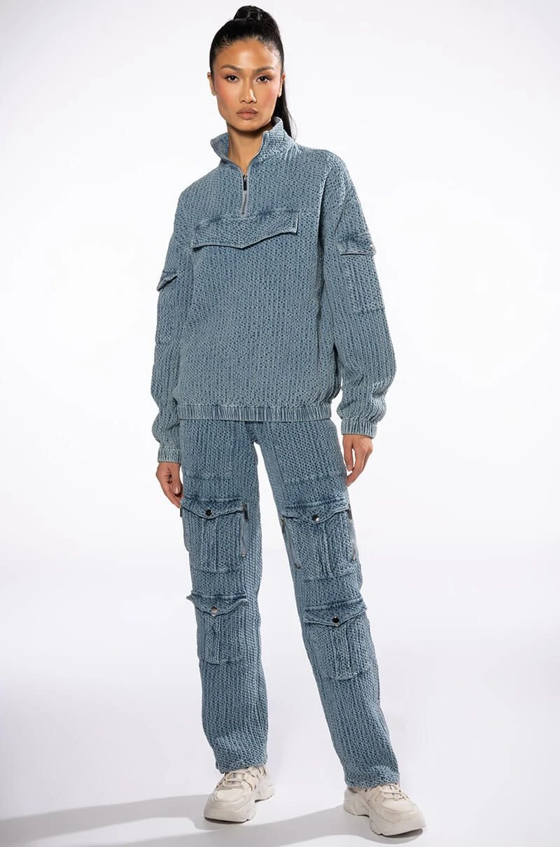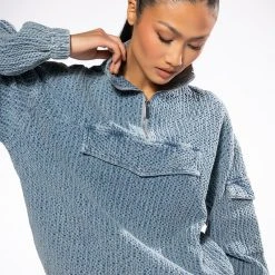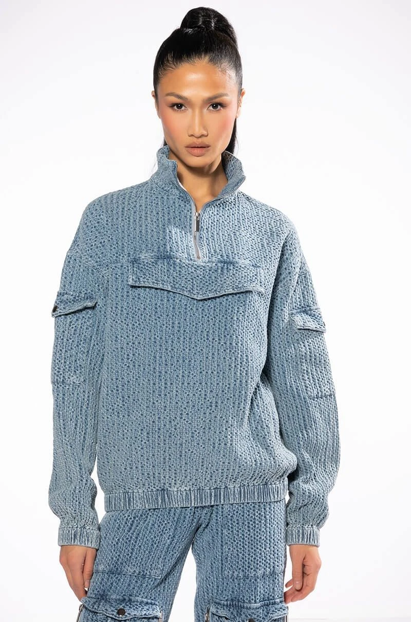 The AKIRA Label Monte Cozy Pocket Detail Half Zip Sweatshirt is made from a textured knit fabrication and features a standing collar, long sleeves with snap button pockets and ribbed elastic wrists, a center mock pocket detail, a boxy fit, and a ribbed elastic hem. Complete with a half zip front closure. Pair this piece with the coordinating AKIRA Label Monte Cozy Knit Pocket Detail Jogger to complete your look.