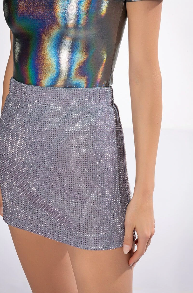 The AKIRA Label Move All Night Rhinestone Mini Skirt is made from a glittery, iridescent fabrication and features a high rise waist, a wide elastic waistband, allover rhinestone detailing, a mini length silhouette, and a pull-on fit. Style this piece with the matching AKIRA Label Move All Night Rhinestone Smiley Face Sheer Mesh Top for a complete look.
