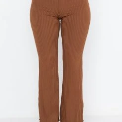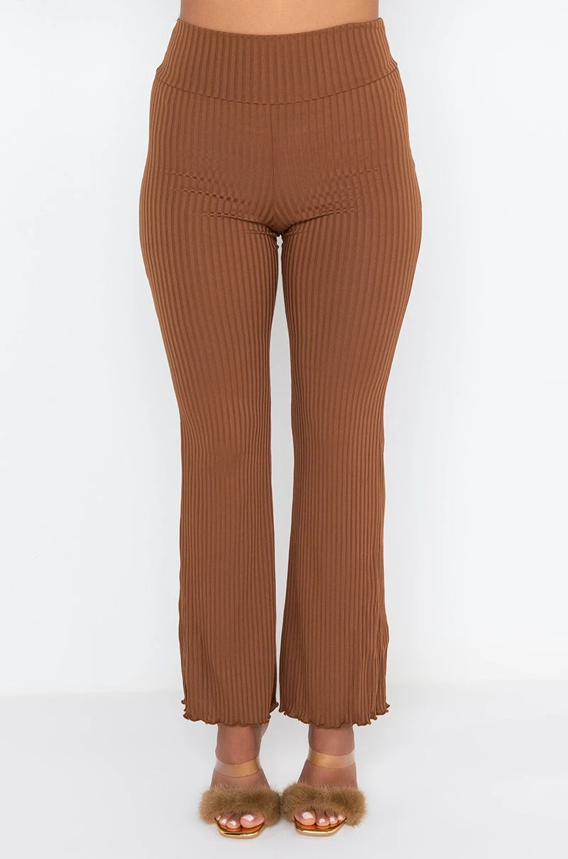 The AKIRA Label My Clarity Wide Leg Ruffle Pant is made from a ribbed fabrication, and is complete with wide pant legs, a lettuce trim hemline, and a stretchy high rise waistline.