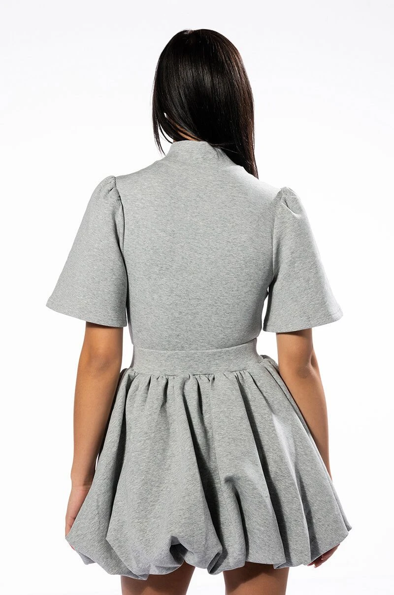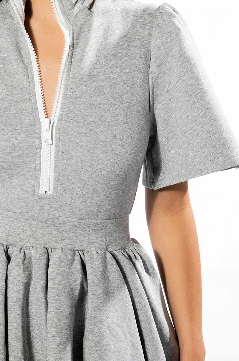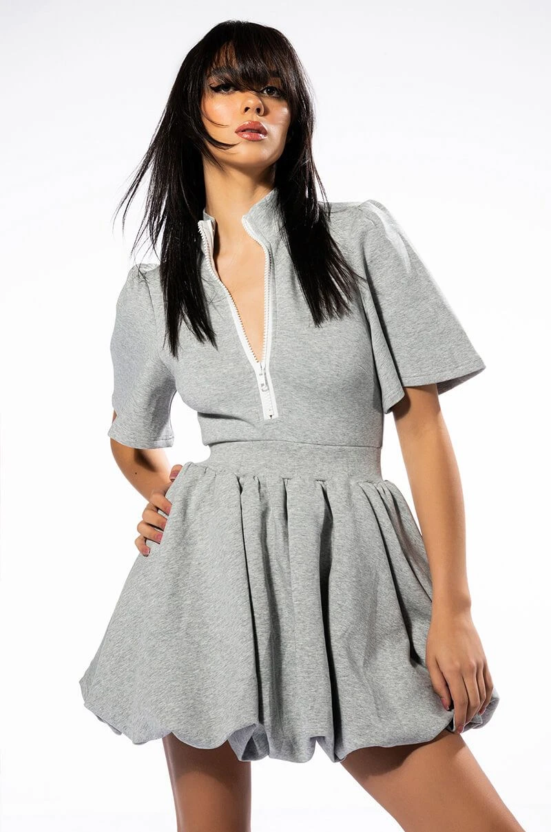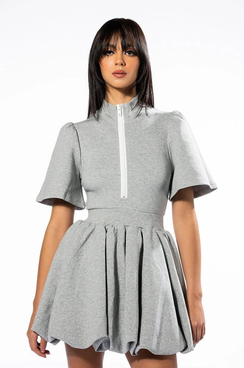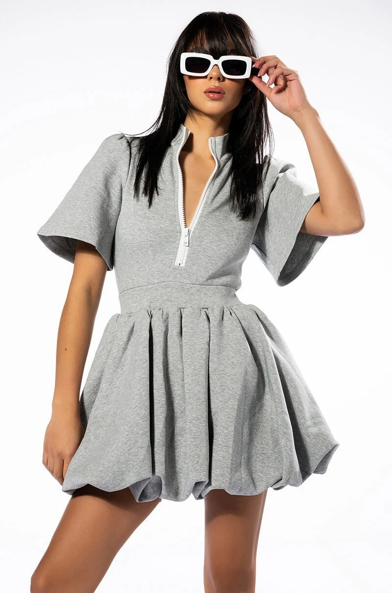 The name of the game is comfortable chic. The AKIRA Label Name Of The Game Short Sleeve Zippered Mini Dress features a cozy cotton sweatshirt material, a mini length, short sleeves, a quarter zip front design, a mock neckline, and a zip front design. Complete with princess seam detailing, a cinched waistband, and a voluminous bubble hem design. Style with your favorite high top sneakers.