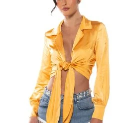 The AKIRA Label Natalie Tie Front Blouse is giving us chic, lounging on a café terrace, drinking café au lait vibes. Made from a luxe, satin base fabrication this ultra chic top features a plunging neckline, a notch lapel foldover collar, and long sleeves with buttoned cuffs. Complete with a long, self-tie front closure. Style with denim jeans and stiletto booties for that effortless, It-girl look.