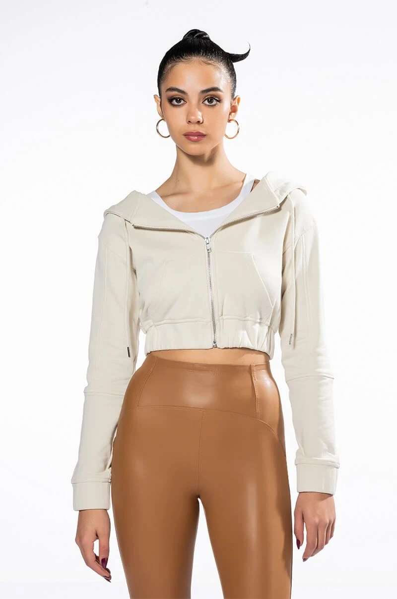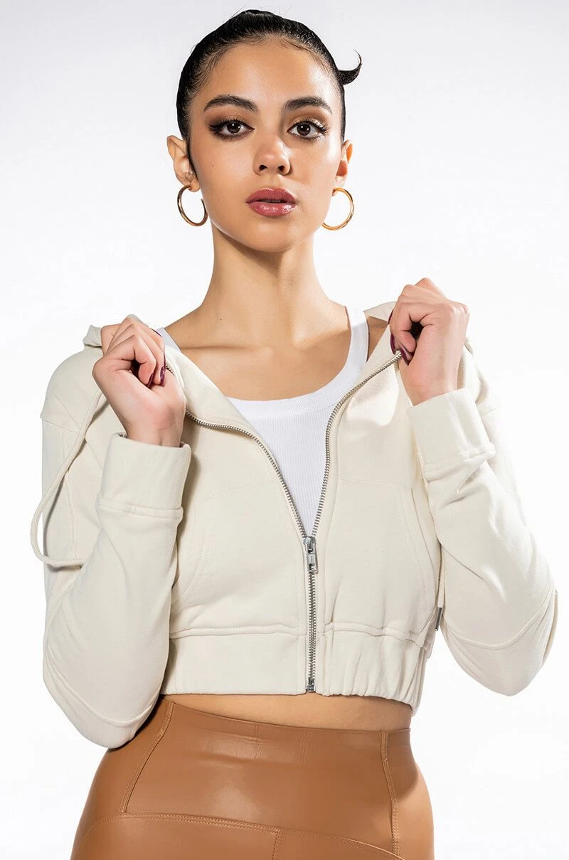 The AKIRA Label New Rules Crop Hoodie features a classic cotton blend fabrication, a cropped length, a drawstring hood, a ribbed elastic waistband, and a front zipper closure. Complete your look with a cropped bralette and cozy joggers.
