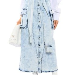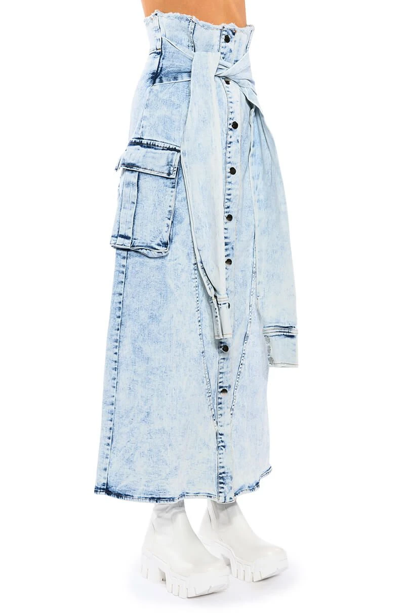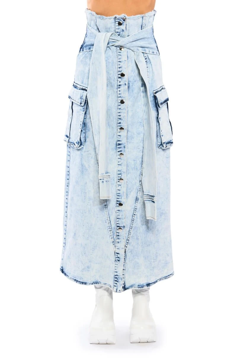 The AKIRA Label Next Up Bleached Denim Maxi Skirt is made from a bleached denim fabrication and features a frayed ultra high rise waist, cargo flap side pockets, a maxi length silhouette, and snap button front closures. Complete with mock denim jacket tie waist sleeve details.
