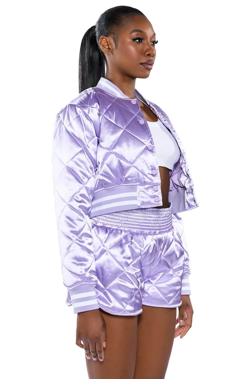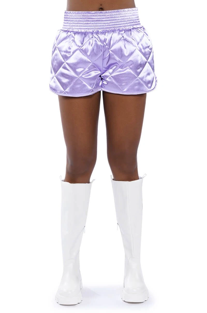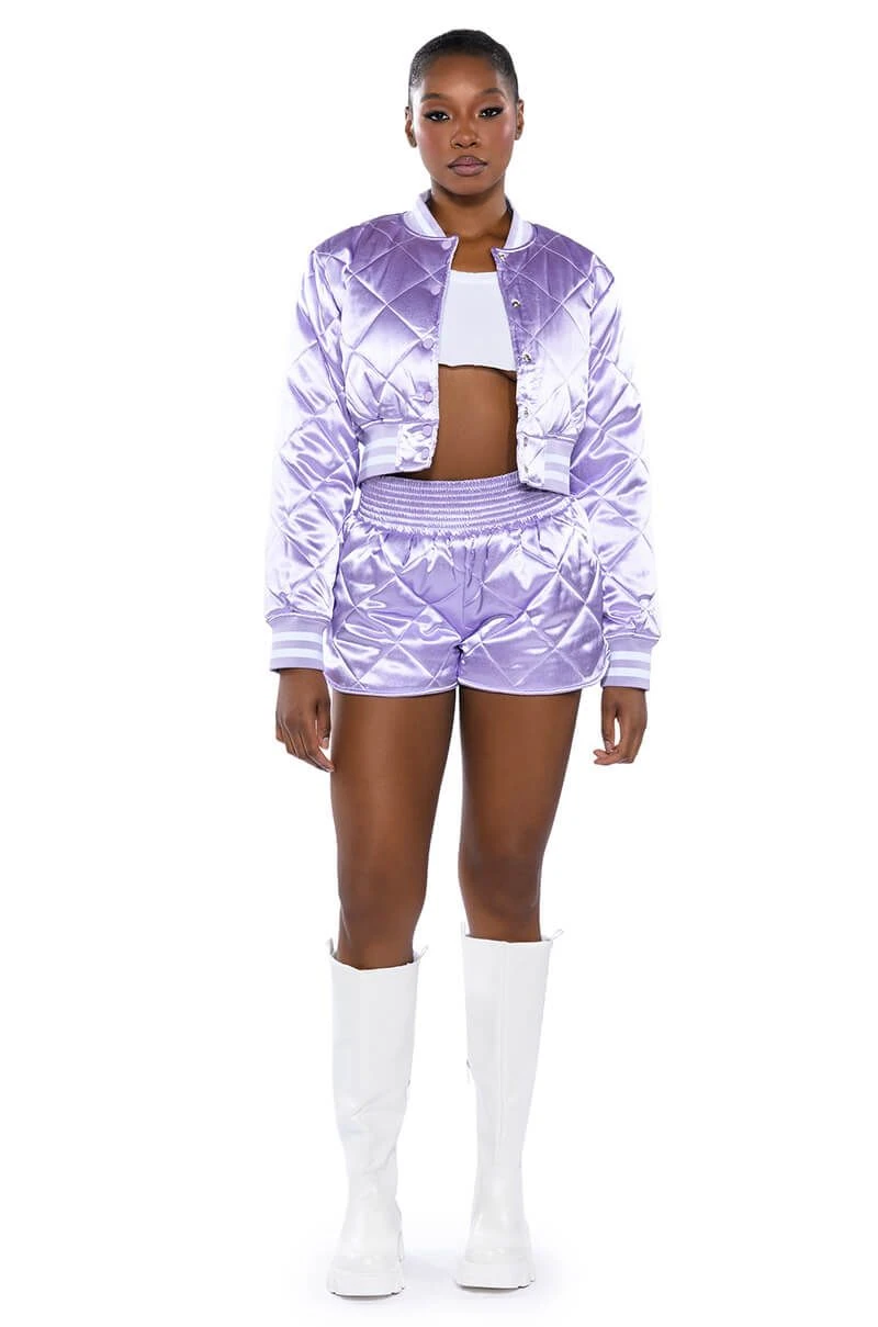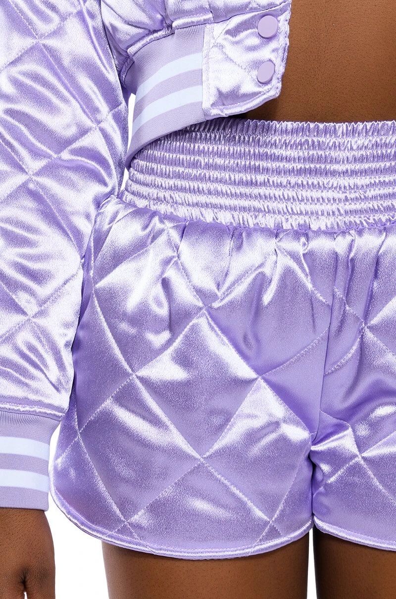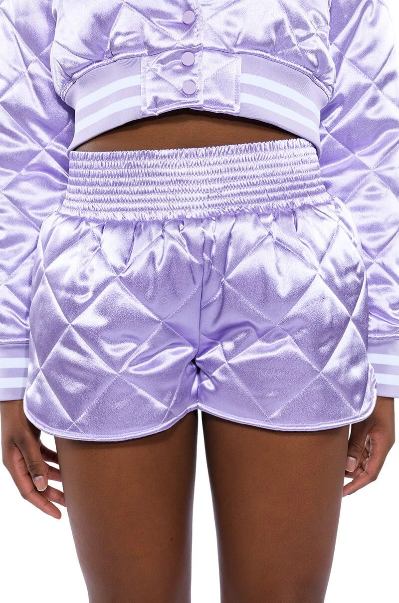 Dead ass the cutest, comfiest shorts you’ll ever own. The AKIRA Label No Cap Quilted Satin Dolphin Shorts in Lilac are a fresh take on the classic lounge short featuring a plush quilted satin fabrication, a cinched elastic high rise waist, and a dolphin short silhouette. Complete your look with The coordinating AKIRA Label No Cap Cropped Satin Varsity Bomber in Lilac.