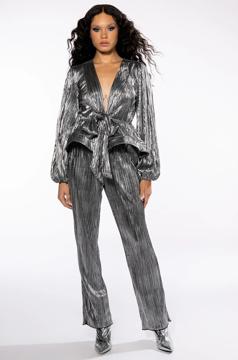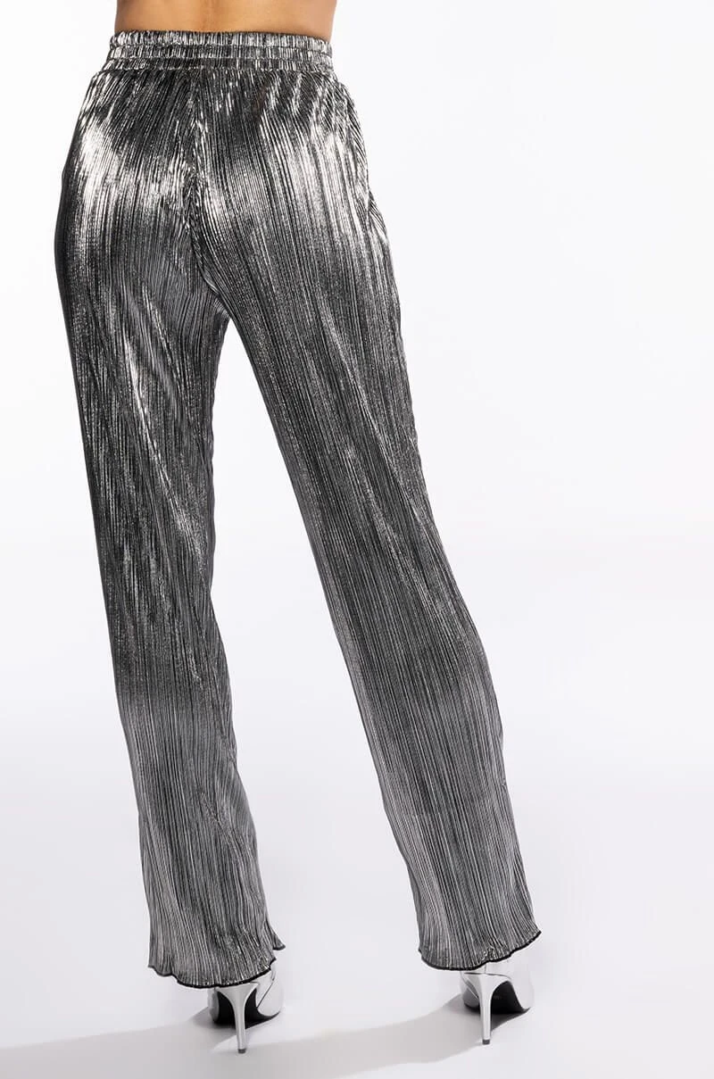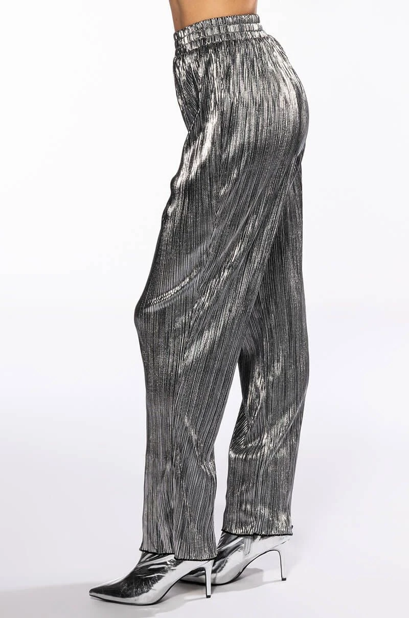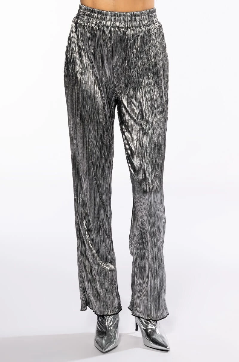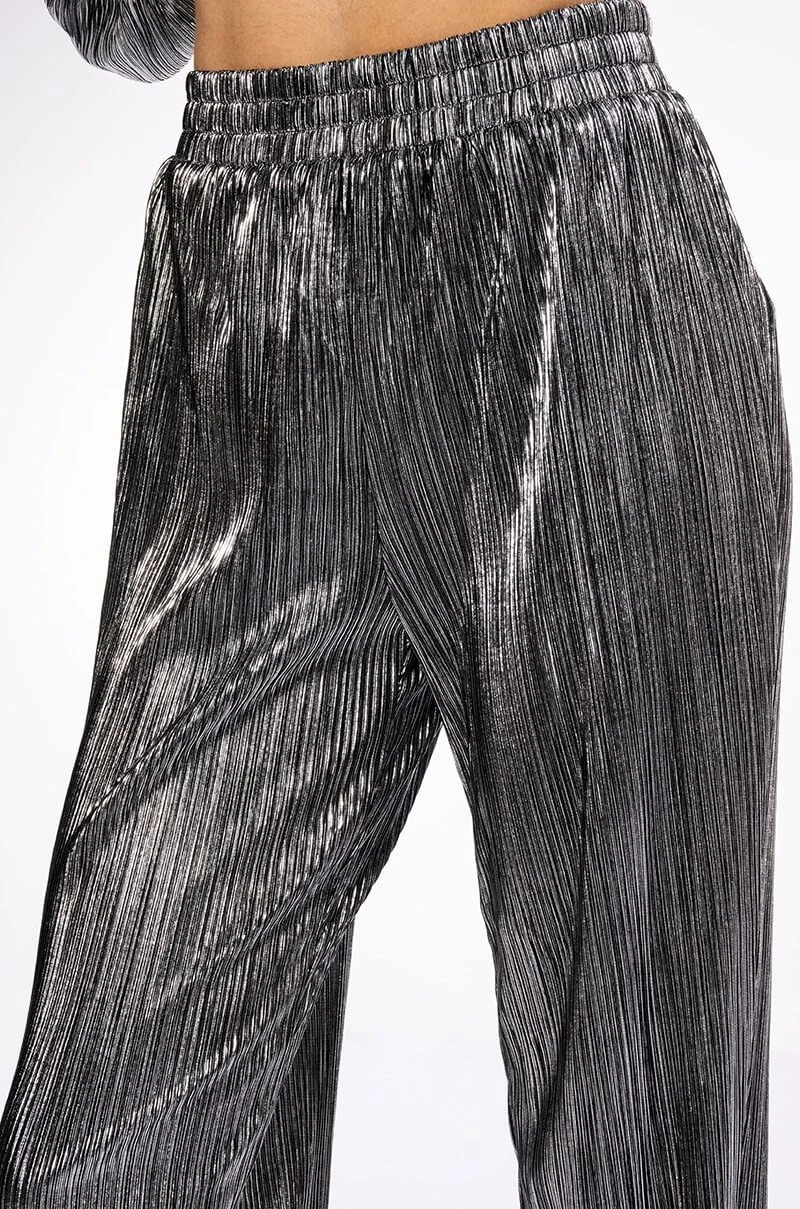 The AKIRA Label Noel Pleated Metallic Palazzo Pant is made from a pleated metallic fabrication and features a high rise waist, a shirred elastic waistband, a straight leg silhouette, lettuce trim hems, and a pull-on fit. Pair this piece with the matching AKIRA label noel pleated tie front metallic peplum blouse to complete your look.