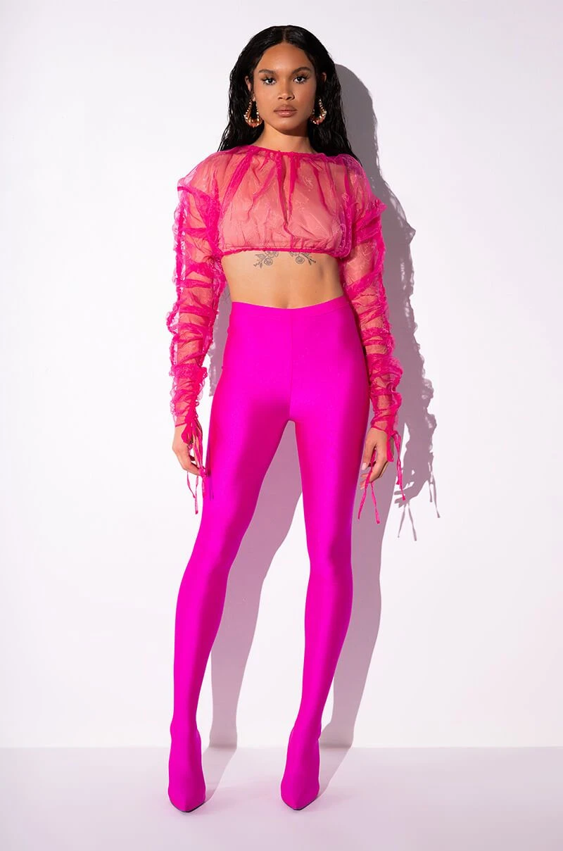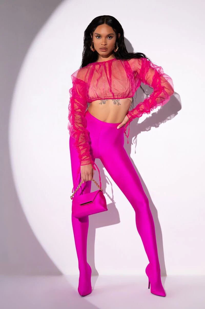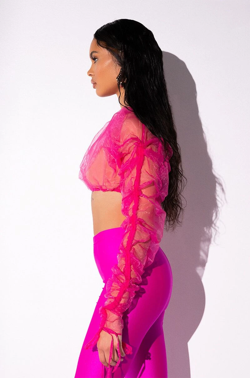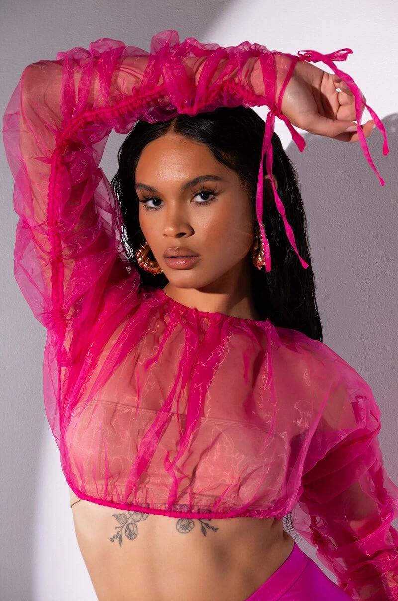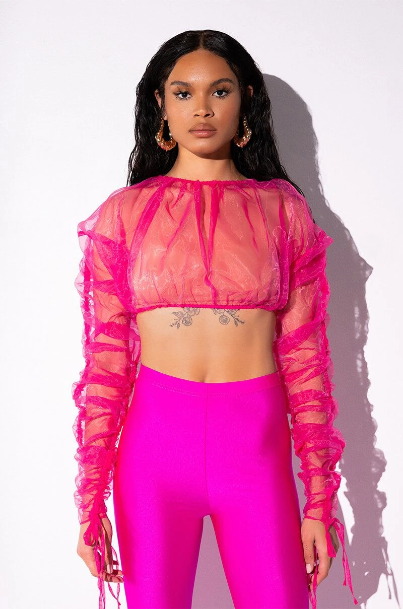 The AKIRA Label Old English Organza Micro Blouse features a floaty, sheer fabrication, an ultra-cropped hem, long voluminous ruched sleeves, and adjustable tie up drawstring cuffs. Complete with a square neckline, elastic trim, and a pull on fit.