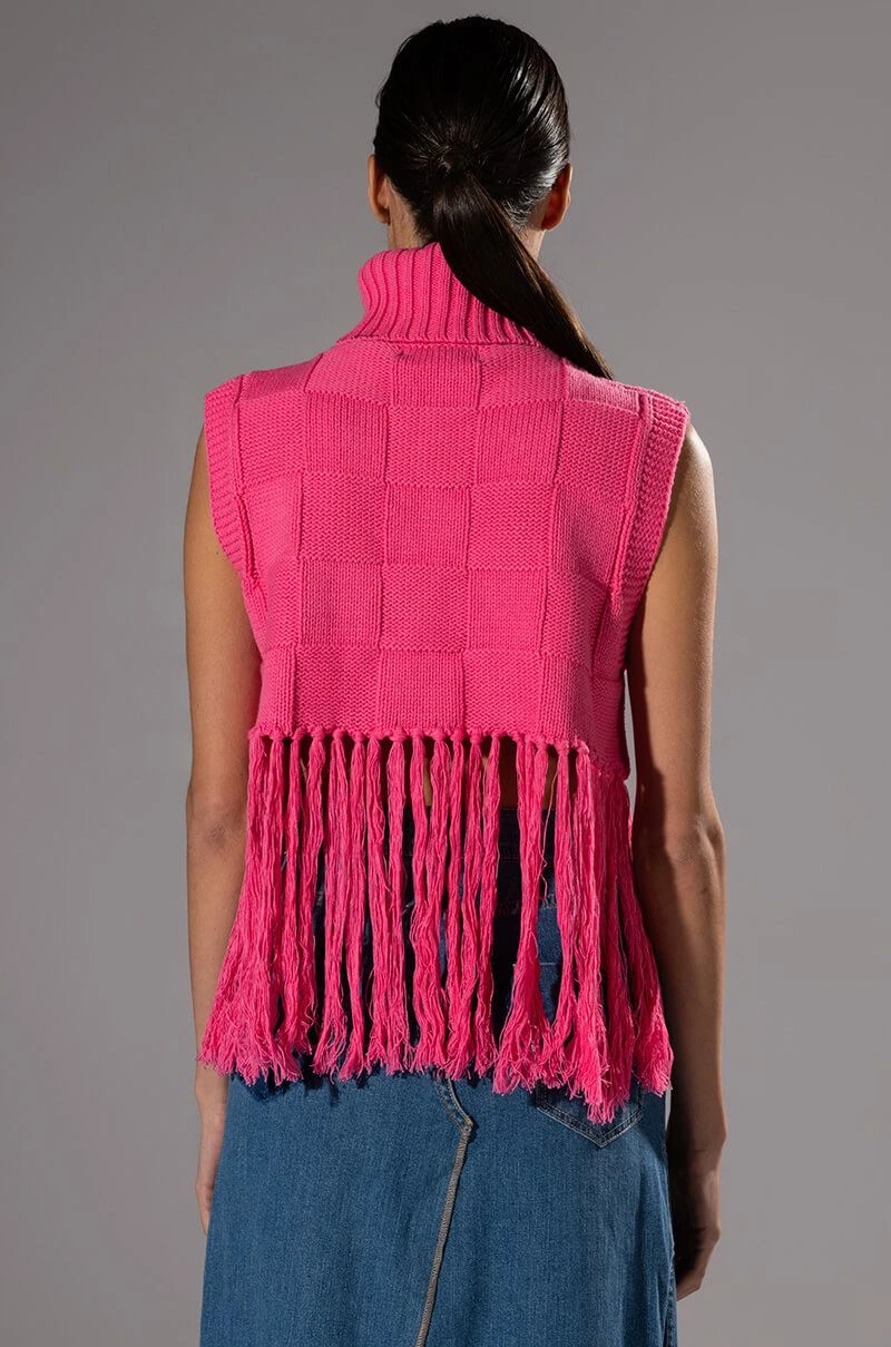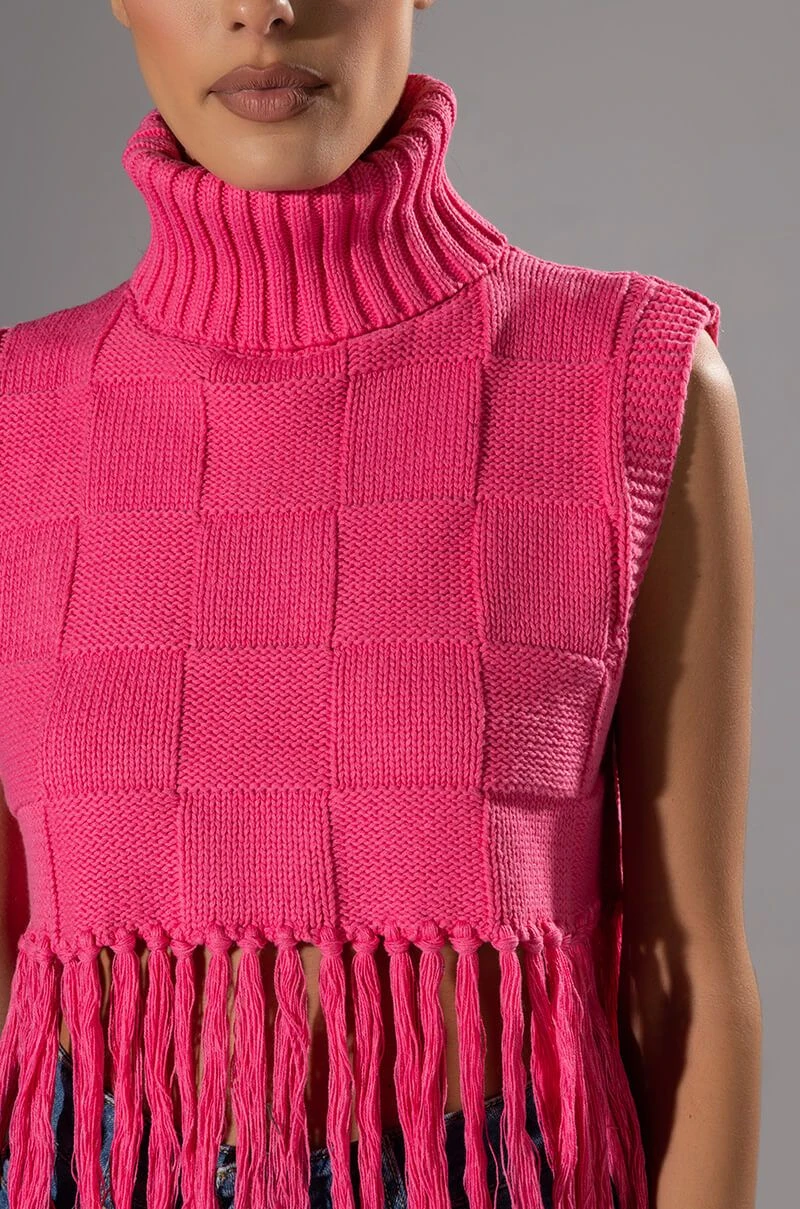 Set your New Year’s Fashion Intentions with The AKIRA Label On Purpose Sleeveless Turtleneck Fringe Sweater In Pink! This vibrant turtleneck sweater features a square knit base, a sleeveless design, and long fringe tassels at the hem. Pair with a white crew neck T Shirt, skinny blue jeans and knee high boots to complete your look!