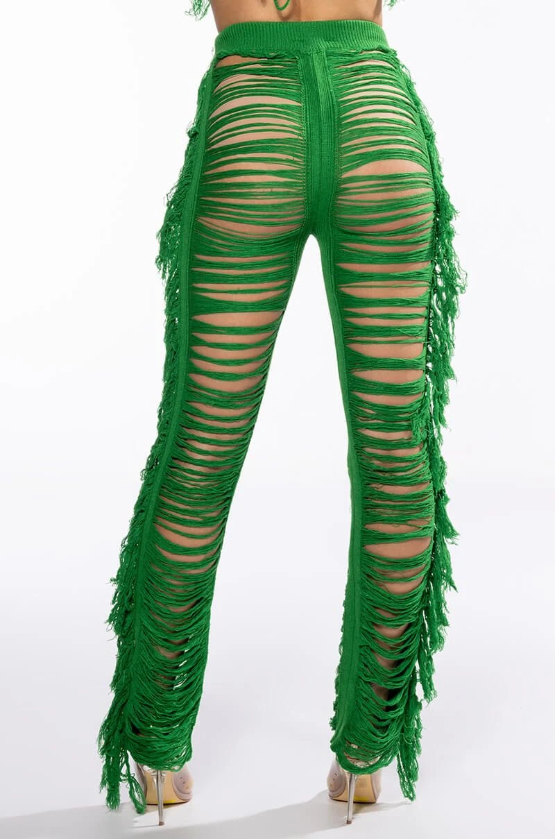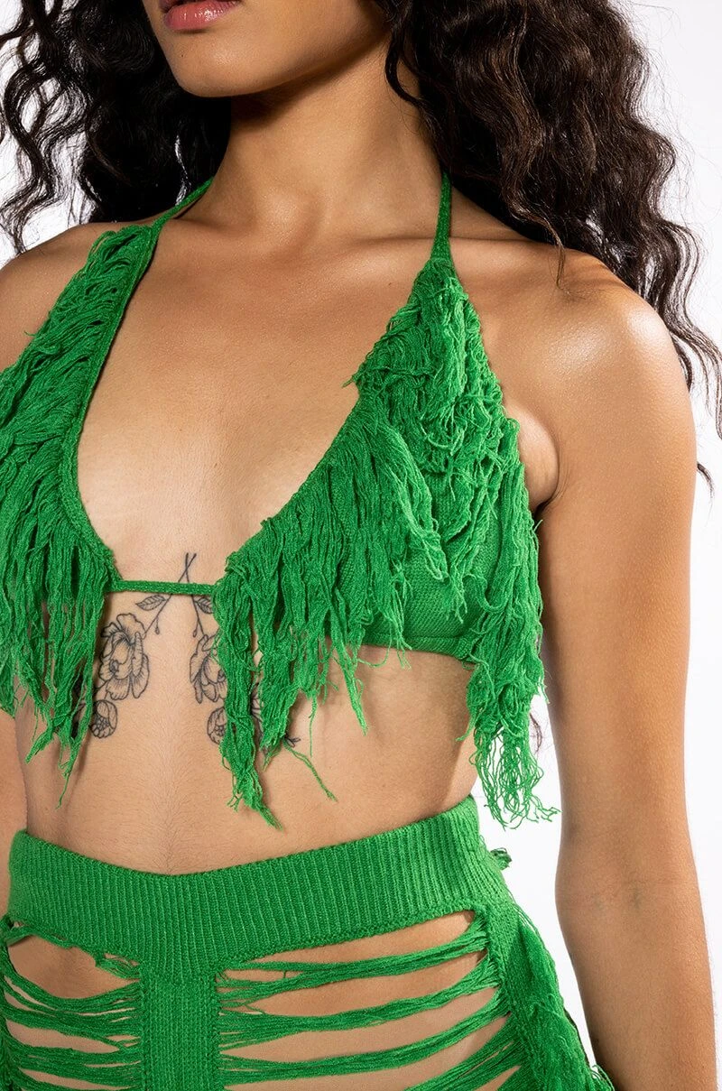 The AKIRA Label On The Border Knit Bralette And Pants Set is made from an unlined knit base and features a bralette and pants. The bralette features a tie halter, a triangular bralette silhouette, fringe hems, and a tie back closure. The pants feature a high rise waist, a covered elastic waistband, skinny fit shredded legs with fringe trim, and a pull-on silhouette. Pair this set with the coordinating AKIRA Label On The Border Knit Top to complete your look.