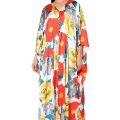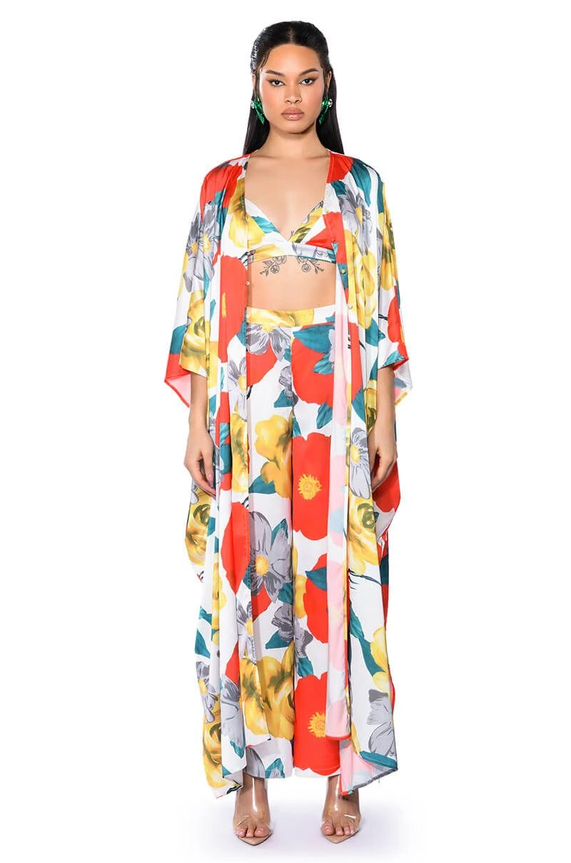 The AKIRA Label On The Patio Kaftan is made from a slick satin fabrication and features a vintage-inspired floral print, a V neckline, a longline kaftan silhouette, a long front slit, and button down front closures. Pair this piece with the matching AKIRA Label On The Patio Triangle Bralette and On The Patio Palazzo Pants to complete your chic lounge-ready look.
