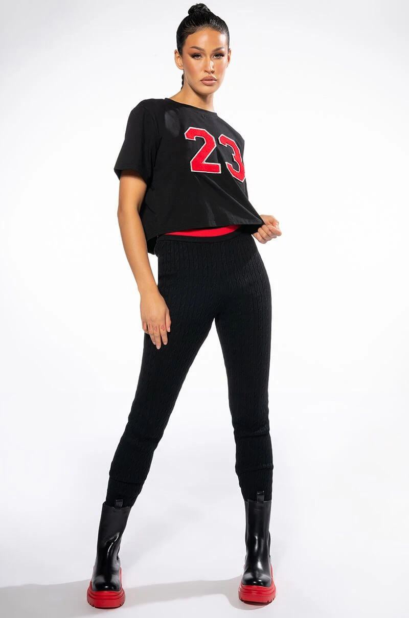 The AKIRA Label One Love Stripe Sweater Legging is made from a cable knit sweater fabrication and features a high rise waist with a striped ribbed knit elastic waistband, a skinny leg fit, striped ribbed knit knit ankle hems, and a pull-on fit. Pair this piece with the coordinating AKIRA Label One Love Stripe Sweater Crop Top to complete your look.