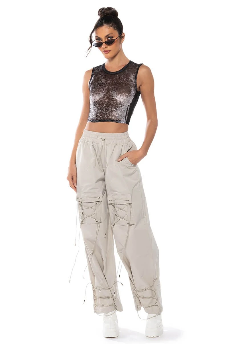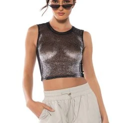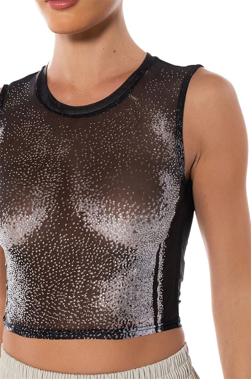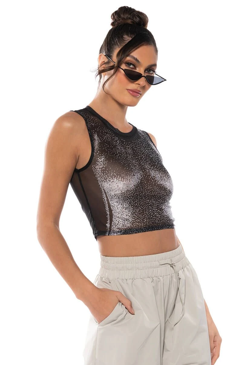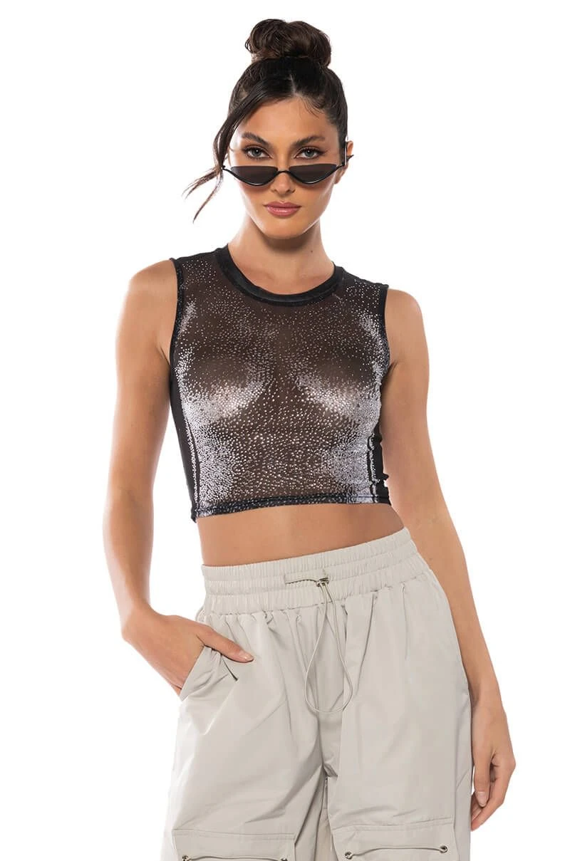 She’s so lucky, she’s a star, it’s The AKIRA Label Out Of This Galaxy Mesh Top! Made from a stretchy, mesh base fabrication, this glimmering number features an abstract nude print design with gorgeous rhinestone embellished details. Complete with a crew neck, a sleeveless silhouette and a cropped top design. Pair with relaxed denim cargos, a moto jacket, and booties, for a finished lewk!