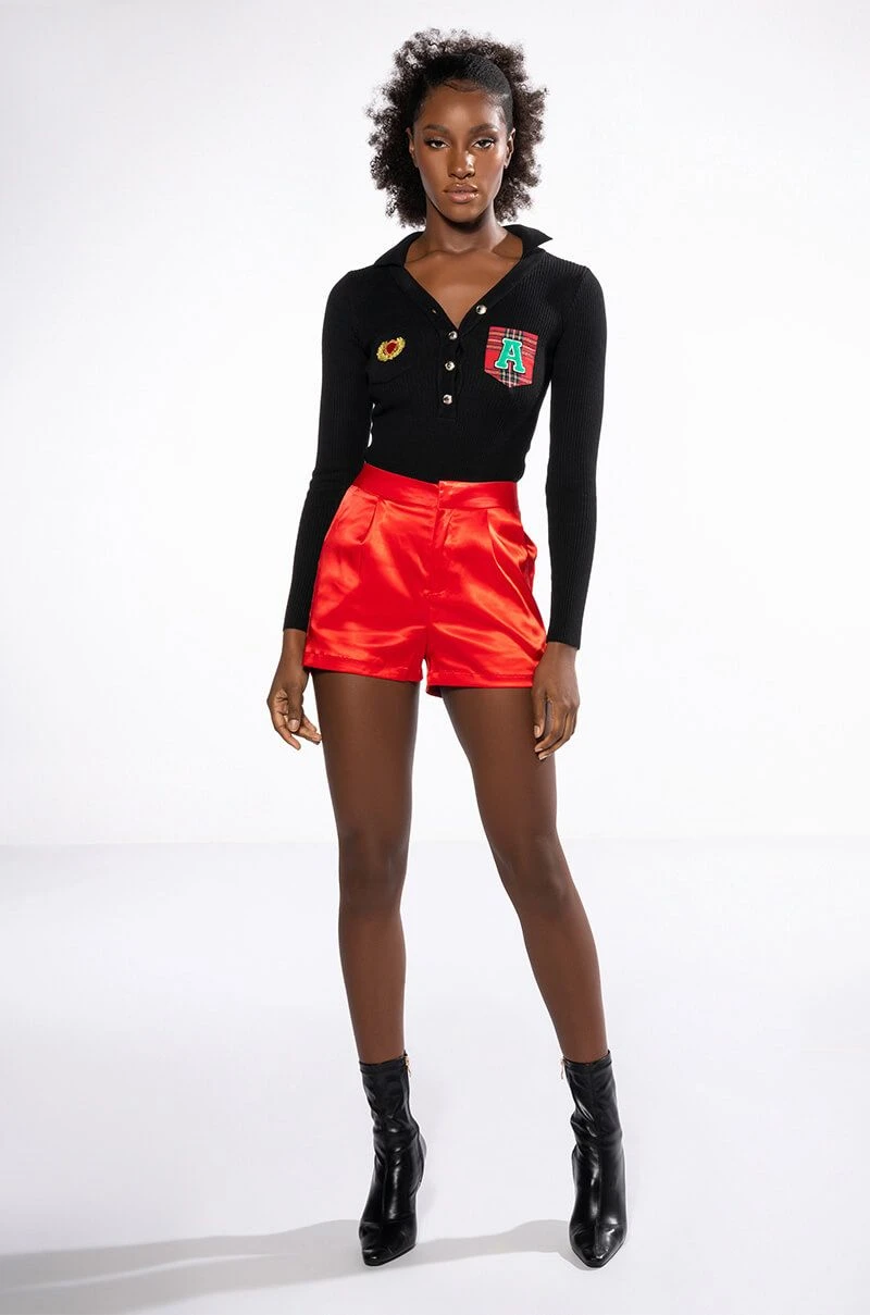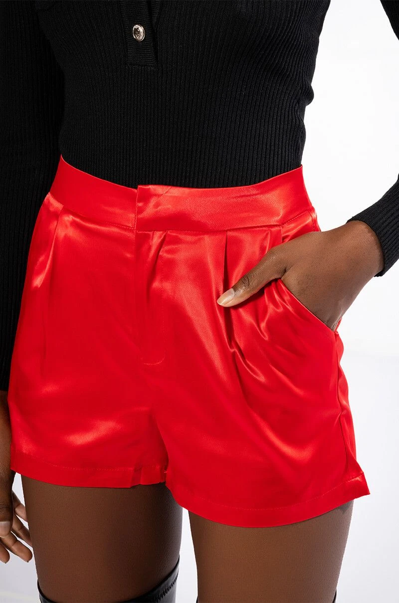 Feel the passion! The AKIRA LABEL Passione Satin Shorts is made from a satin fabrication, and is complete with a high rise waistline, side pockets, mock back pockets, and a clasp and zipper closure.
