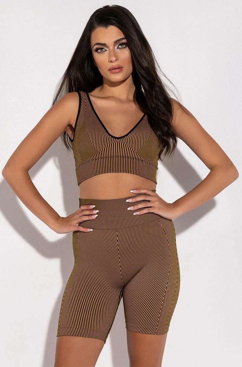 The Paxton Green Light V Neck Bralette is made from a soft knit fabrication and features striped stitch patterning, a rounded V neckline, wide tank straps, padded cups, contrast trim along the neckline and straps, and a wide elastic hem. Pair this piece with the matching Paxton Green Light Biker Shorts and chunky sneakers to finish off your fresh athleisure look.