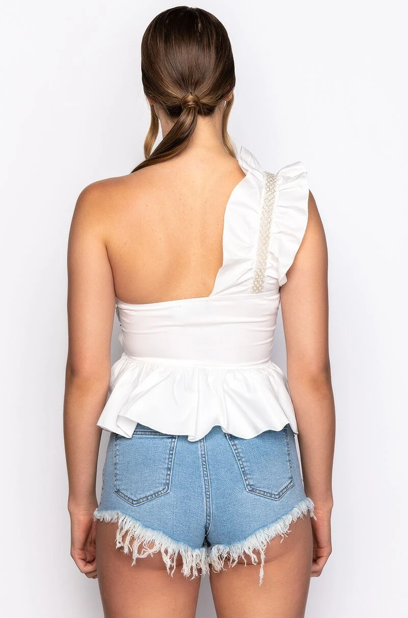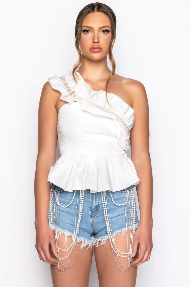 The AKIRA Label Pearl Detail One Shoulder Poplin Peplum Blouse is made from soft poplin cotton and is complete with a ruffled one shoulder detail with pearl trim and lattice detailing along the chest, a rounded neckline, peplum hem, and an invisible side zipper closure.