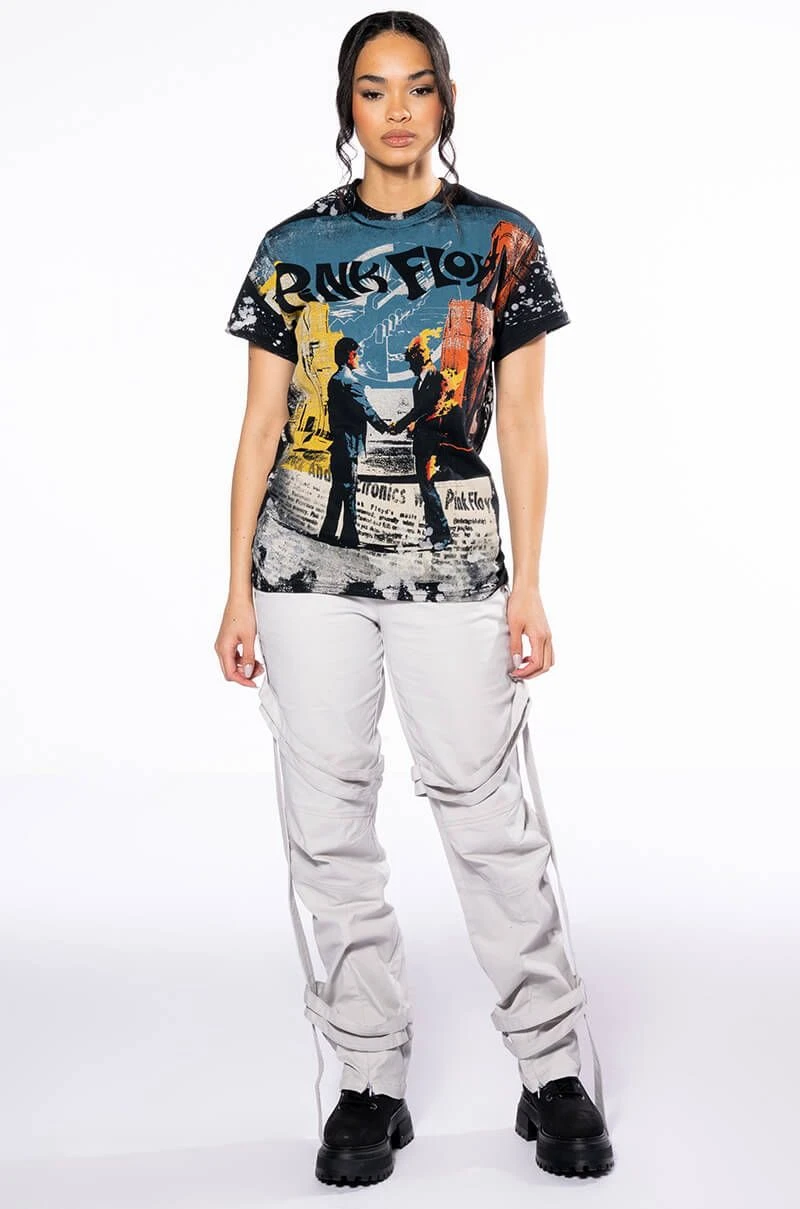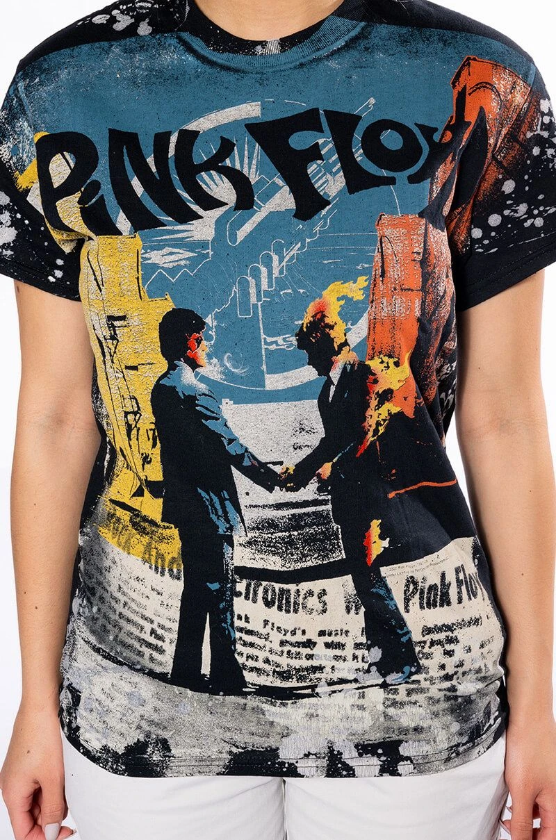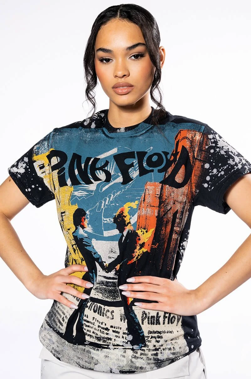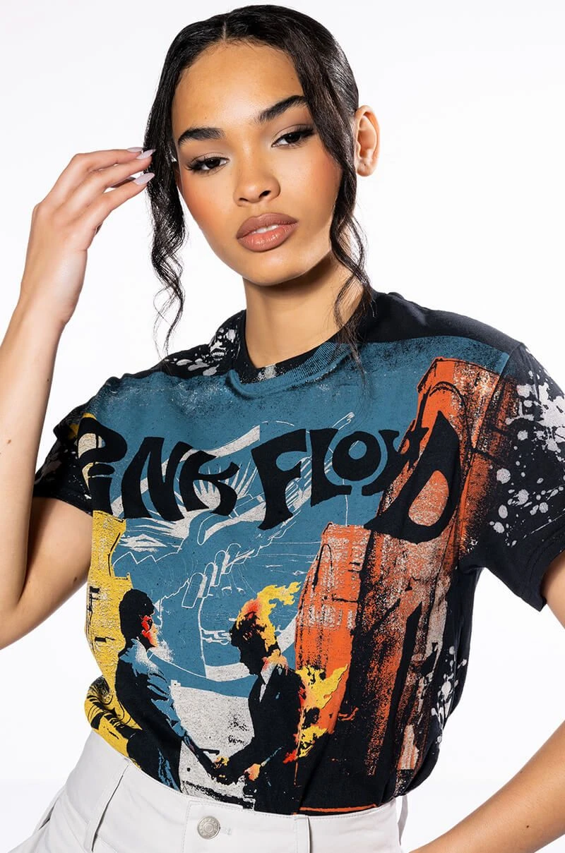 The Pink Floyd Splatter Graphic Tshirt is a cotton-based graphic tee featuring a crew neckline, short sleeves, a large Pink Floyd print graphic, and splatter detailing. Pair this tee with distressed denim and combat boots to finish off your edgy rocker look!