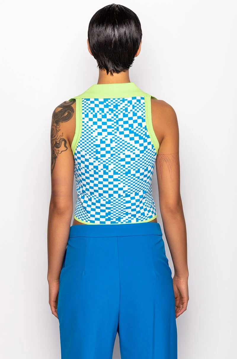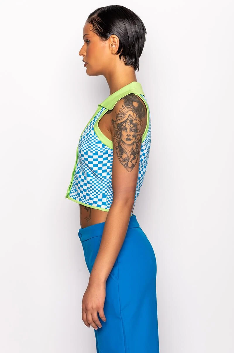 The AKIRA Label Play It Again Cropped Collared Top is made from a stretchy knit fabrication and features a warped geometric pattern, a plunging collared neckline, sleeveless silhouette, cropped length, and front button closures. Pair this piece with wide leg bottoms and booties for a funky fresh casual look.