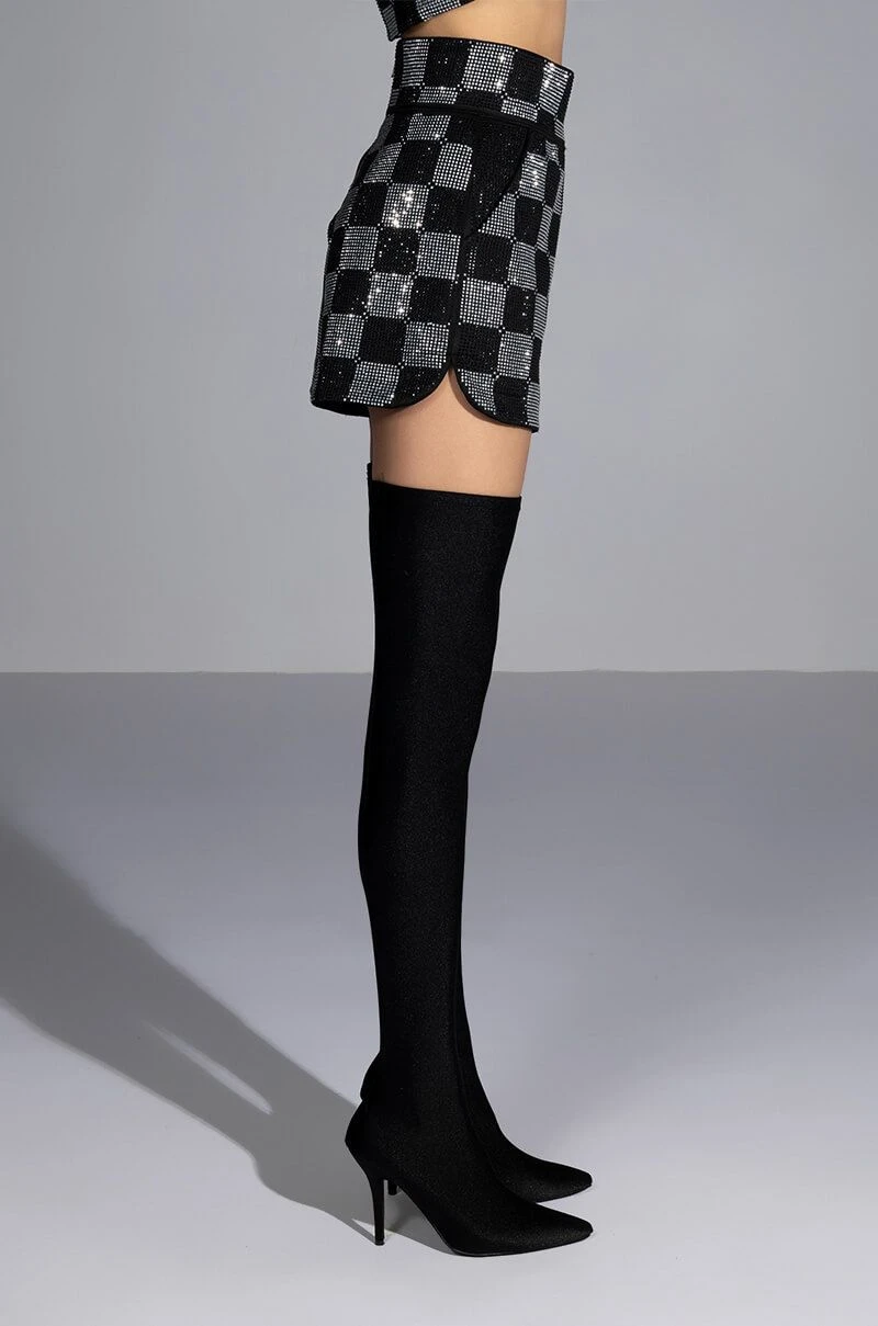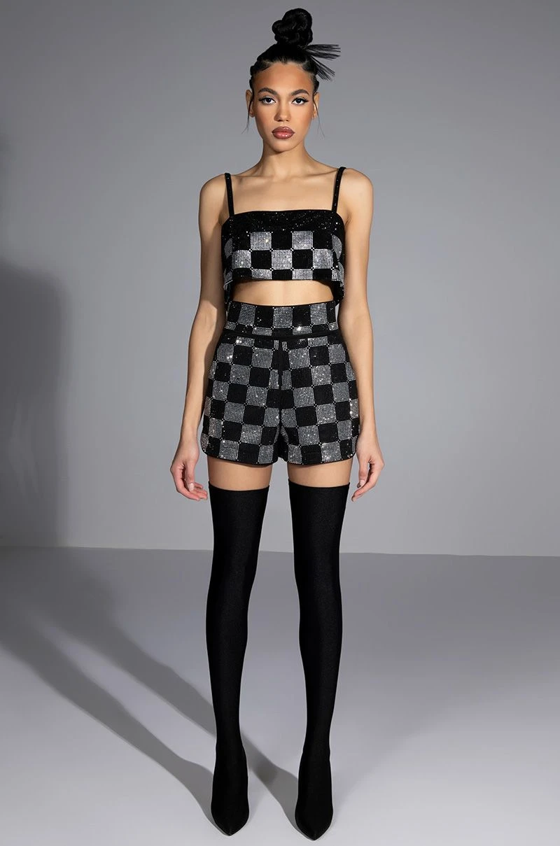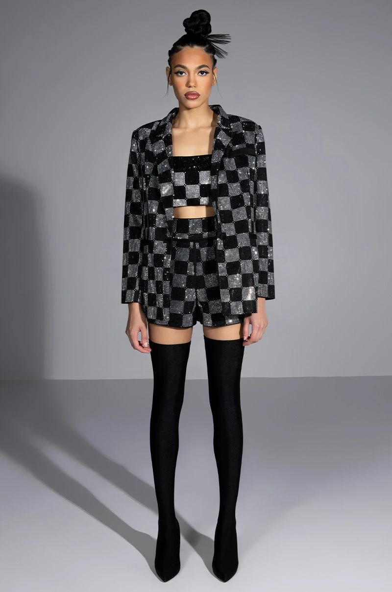 Get your choreo ready, it’s time to put on a show in The AKIRA Label Pop Star Checkered Rhinestone Short. This rhinestone-embellished dolphin shorts features a high rise waistline, rhinestone checkered patterning throughout, slant side pockets, and a hot pant silhouette. Complete your look with The Pop Star Checkered Rhinestone Blazer.