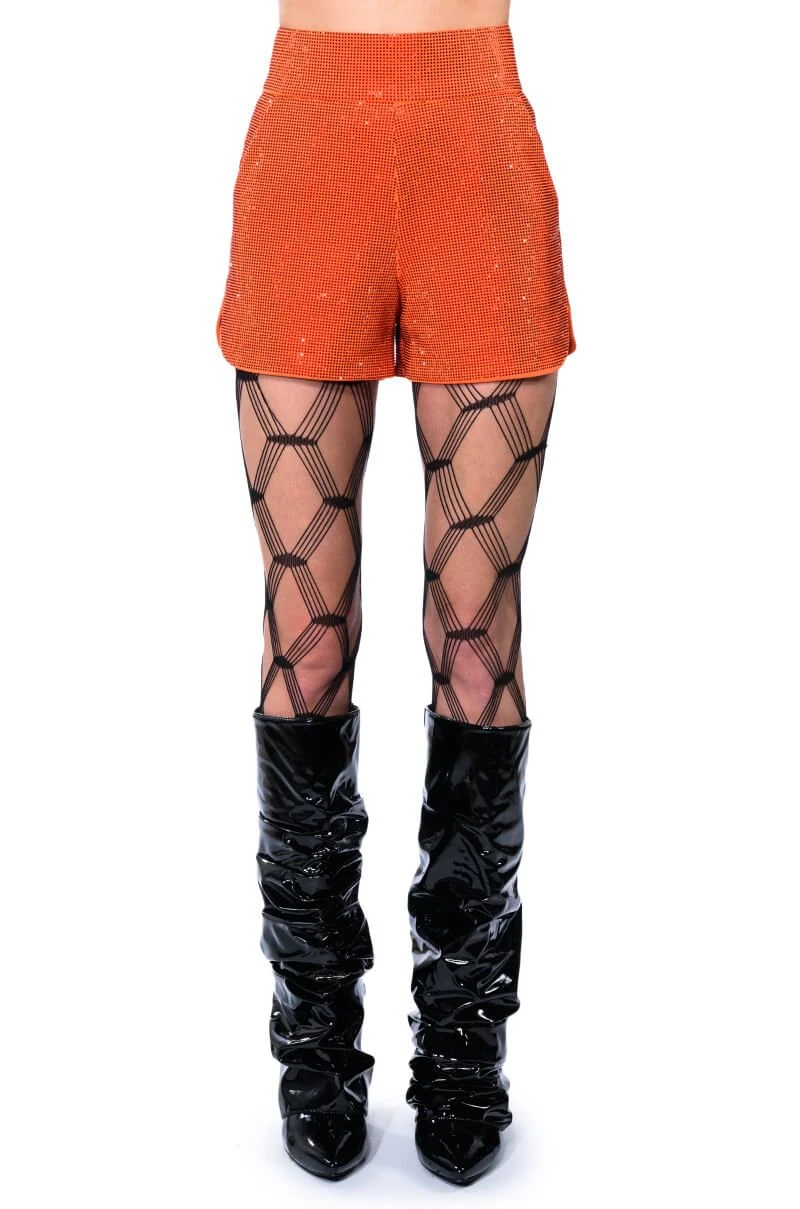 Get your choreo ready. Put on a show in The AKIRA Label Pop Star Shine Bright Rhinestone Hot Short in Orange. This rhinestone-embellished satin dolphin short features a high rise waistline, slant side pockets, and a hot pant silhouette. Complete your look with The Pop Star Shine Bright Rhinestone Blazer in Orange.