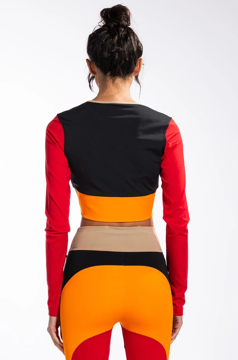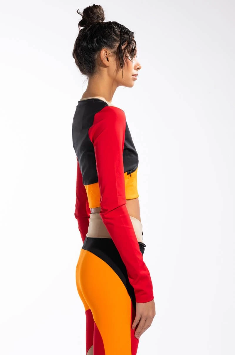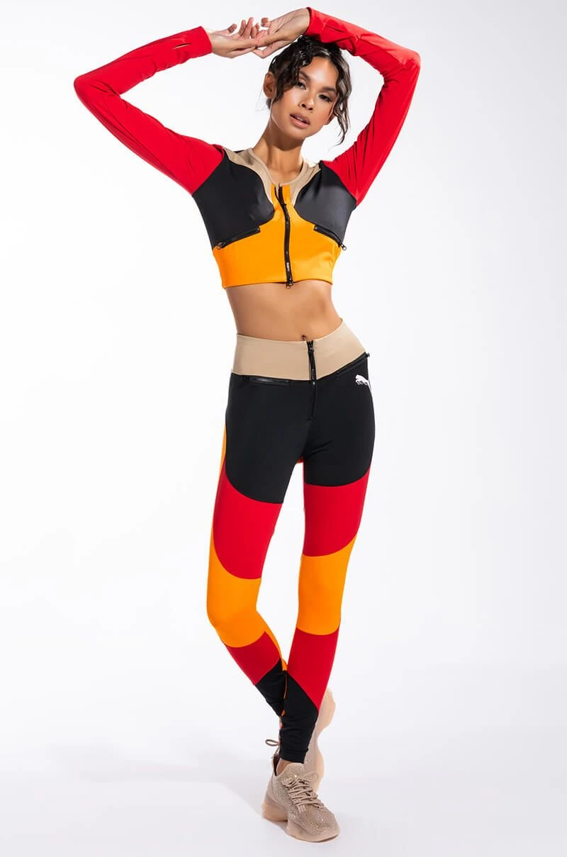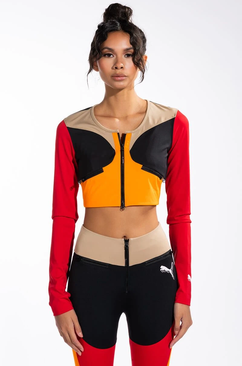 The PUMA Multi Color Unity Crop Top features a tight, bodycon silhouette, cropped cut, and long sleeve design. Complete with a scoop neckline, color blocked detailing, front zip closure, side zip pockets, and a jumping cat logo at the wrist. Pair with PUMA leggings for a cozy athleisure ensemble.