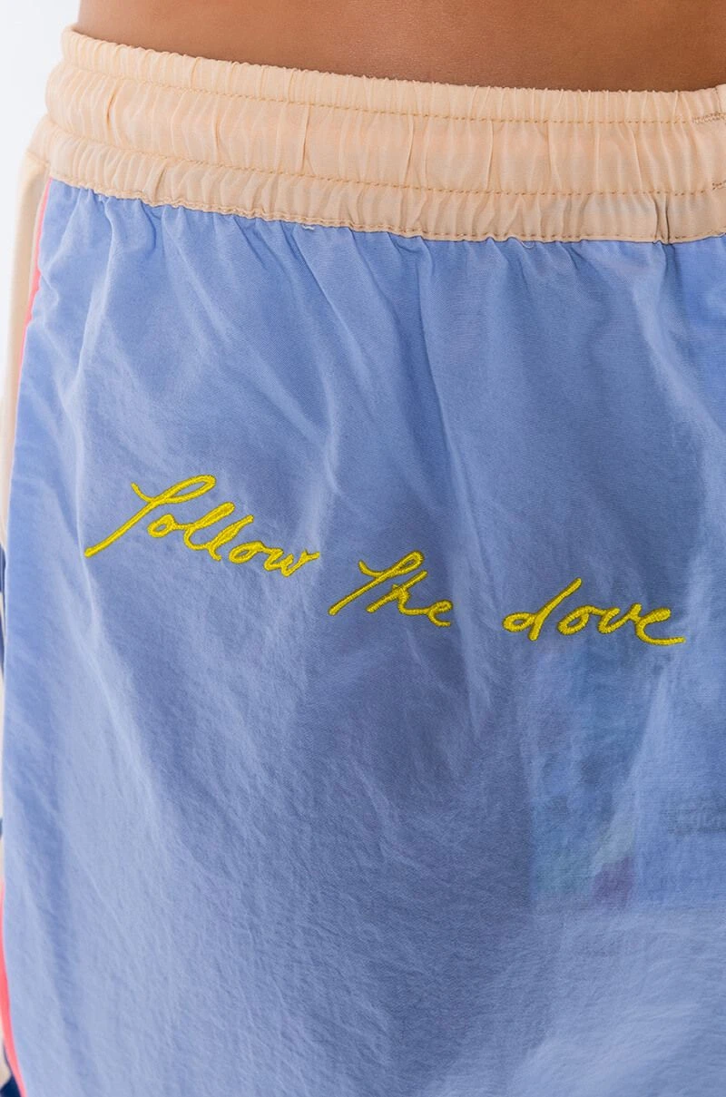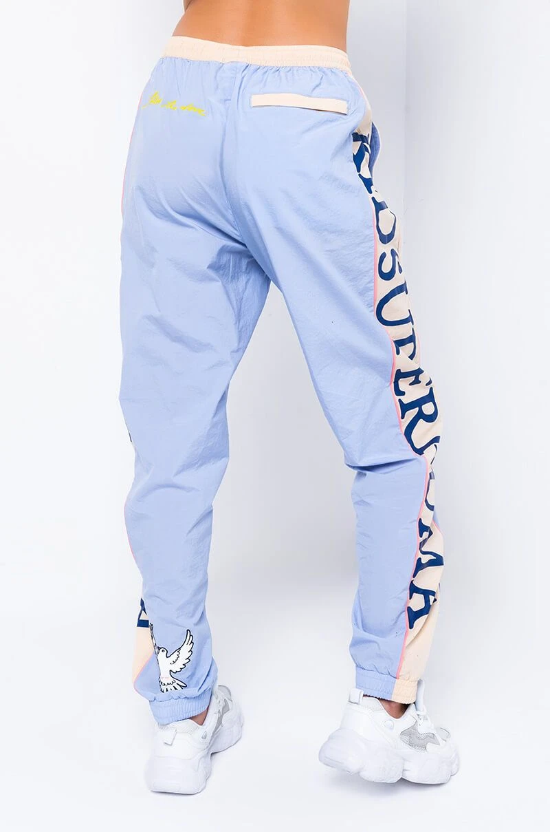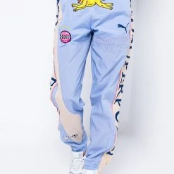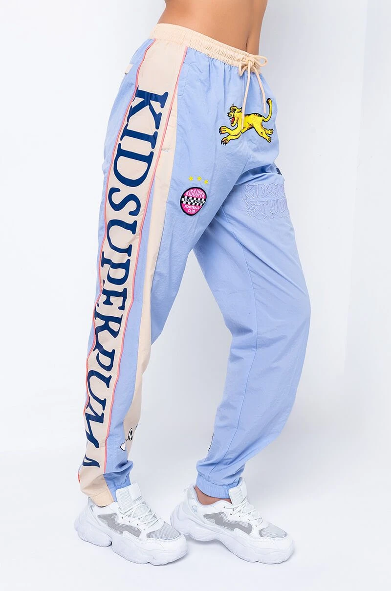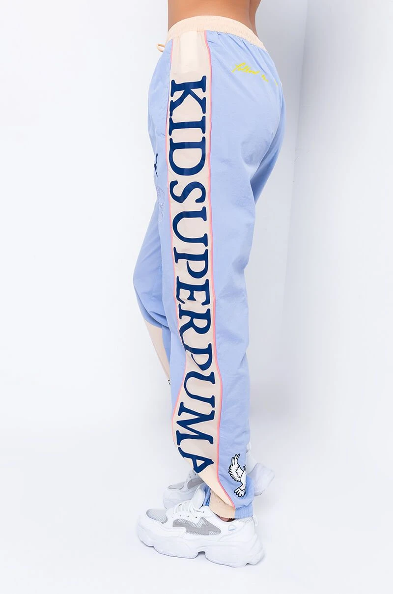 Sport these fun track pants that are a delicious creative collaboration with Kid Super + PUMA. These baby blue and tan track pants feature a variety of decorative patches designed by illustrator Kid Super. The words “Kid Super PUMA”, are printed on the side of each pant leg in navy blue graphics. The words, “Kid Super Studios”, are stitched in baby blue on the front of the left thigh beneath a classic PUMA logo in navy blue. “Follow the Love”, is stitched in yellow on the left butt cheek opposite a slash pocket that hides a matching zipper. Wear with the matching PUMA & Kid Super Color Block Tee and your favorite pastel sneakers for a graphic sport look.